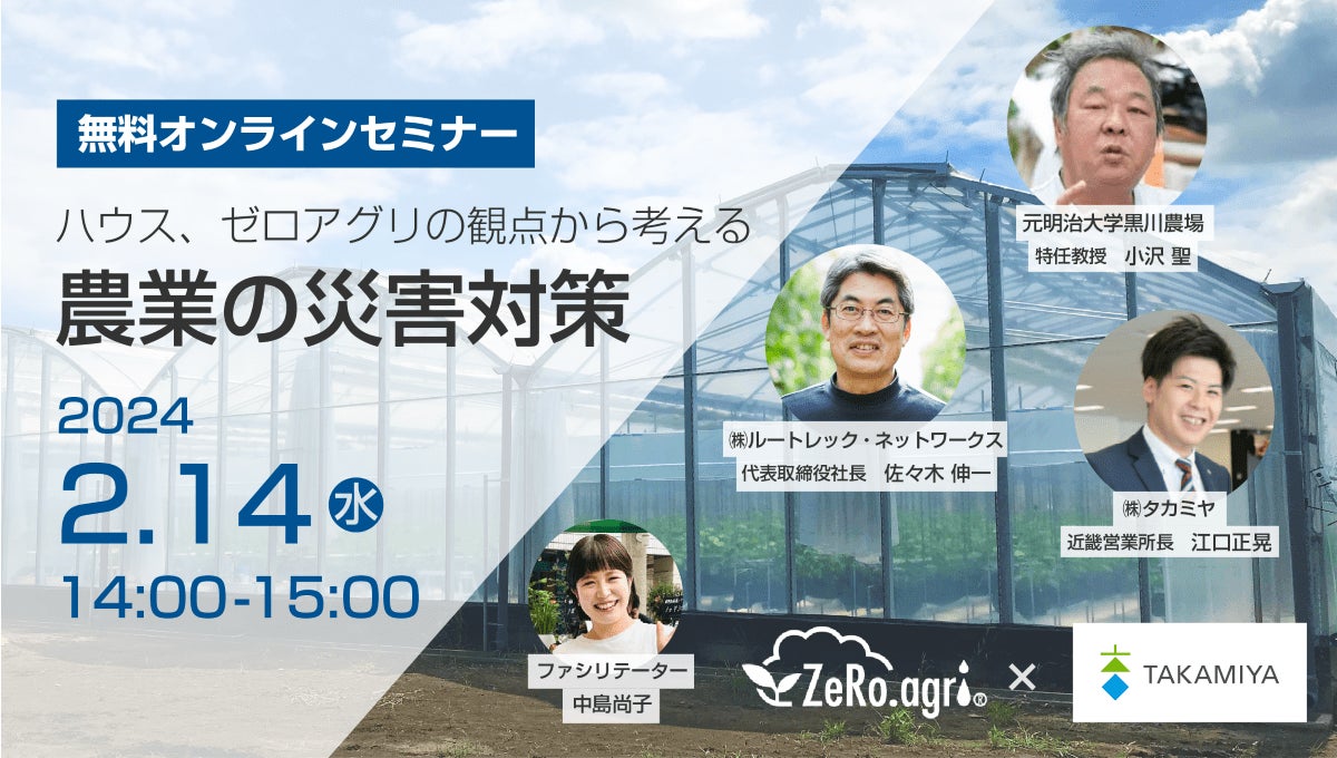 株式会社ルートレック・ネットワークス(本社:神奈川県川崎市 代表取締役社長:佐々木伸一、以下当社)は、農業用ハウスや資材を扱う株式会社タカミヤ(本社:大阪府大阪市 代表取締役会長兼社長:髙宮 一雅、以下タカミヤ)と共同で、「ハウス、ゼロアグリの観点から考える農業の災害対策」と題したウェビナーを2024年2月14日(水)14時より開催をいたします。