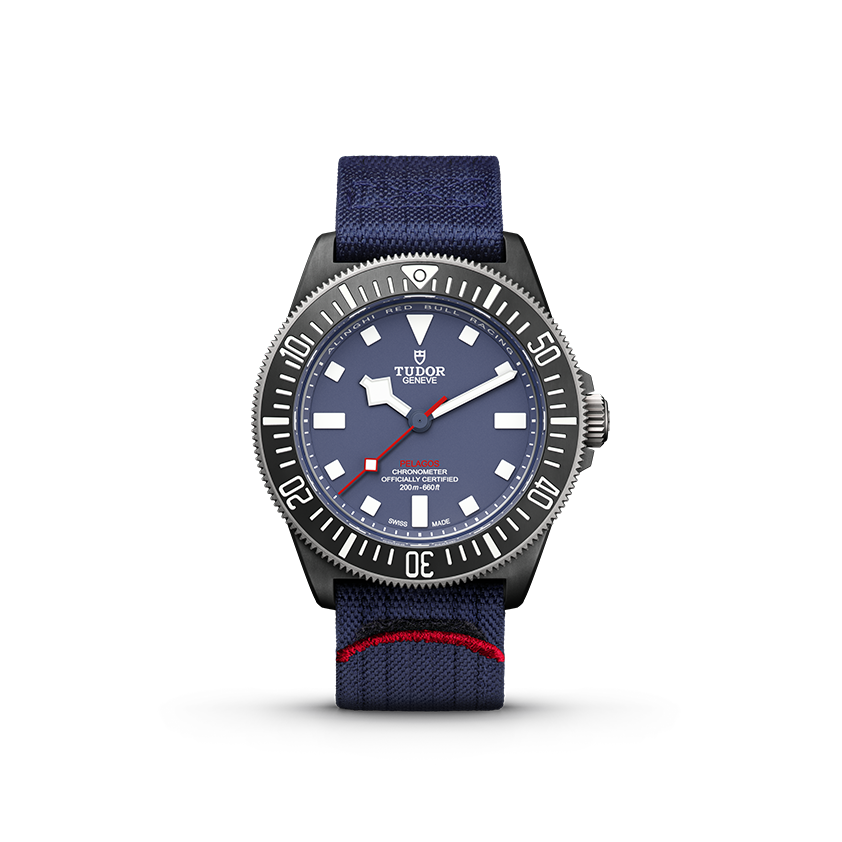 チューダーは2010年にいち早くシングルピースのファブリックストラップを採用して以来、常に先駆者であり続けている。フランスのサン・テティエンヌで150年以上家族経営を続けるジュリアン・フォール社によって、19世紀製の織機を用いて生み出されるファブリックストラップ。それは品質と快適さを両立する唯一無二の存在である。ペラゴス FXDのためにジュリアン・フォールとチューダーは、新しい構造のストラップを開発した。レッドのアクセントが入った「チームブルー」のジャカード織りリボン(幅22mm)にセルフグリップ着脱システムとチタン製バックルを組み合わせた新ストラップは、あらゆる手首に快適にフィットする。