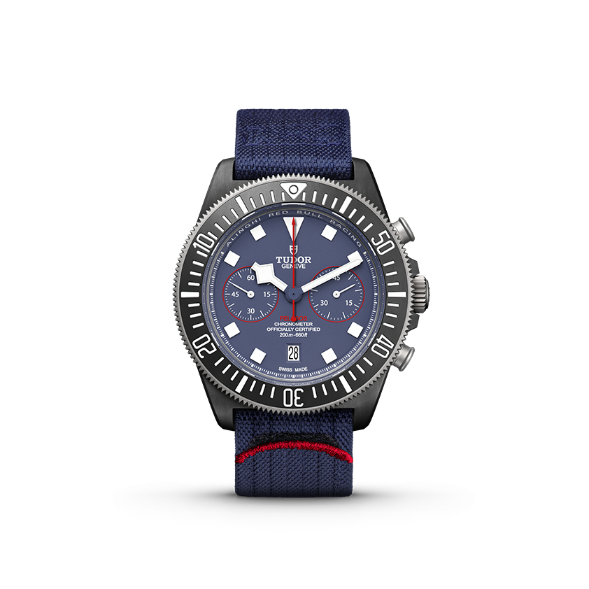 AC75の船体と同じ色調のマットなダイアルは、視認性を最優先する。どちらのダイアルもアリンギ・レッドブル・レーシング チームのブルーで彩られ、レッドの秒針またはクロノグラフ秒針を備える。さらにクロノグラフモデルではカウンターの周りにもレッドのアクセントが施され、AC75の船体を飾る赤いストライプを連想させる。45度の角度のついたフランジの10と2の間には、“Alinghi Red Bull Racing”の文字がさりげなくアーチ状に記されている。象徴的なスクエア型アワーマーカーと「スノーフレーク」針は、視認性を向上させるために発光面を最大化できるデザインとして、60年代にチューダーが考案。本作では、厳しい条件下でも最適な視認性を実現する発光性セラミック混合物で作られている。
