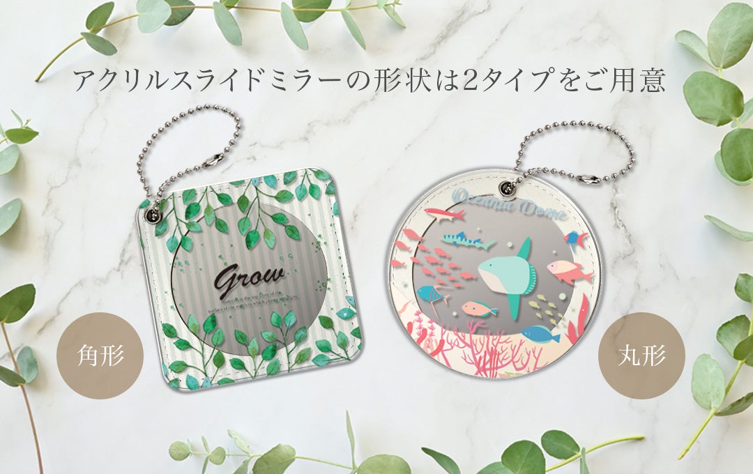 オリジナル アクリルスライドミラーは「丸型」と「角型」の2種類からお選びいただけます。