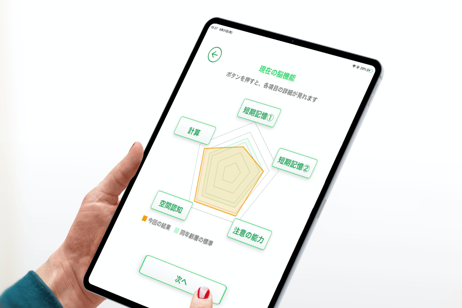 「CQ test®」は、健常な方から認知機能を簡単に測定できる独自の認知機能テストです。iPadを用いて、5〜8分程度で測定でき、受診者様はもちろん、医療機関様においても大きな負荷なく導入が可能です。認知機能はCQスコアとして可視化され、結果に基づいた簡単なアドバイスを表示でき、結果レポートを発行します。