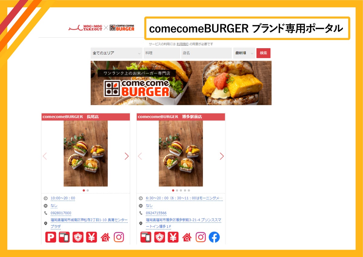株式会社ジールプロダクト(本社:福岡市中央区、代表取締役:林田 浩幸)が運営する、テイクアウトPRサービス「モグモグテイクアウト」は、株式会社COME COME BURGER(本社:福岡市中央区、代表取締役:別府 崇)が運営する、お米バーガー専門店「comecomeBURGER」のブランド専用ポータルを11月17日にリリースいたします。順次掲載店舗追加予定です。