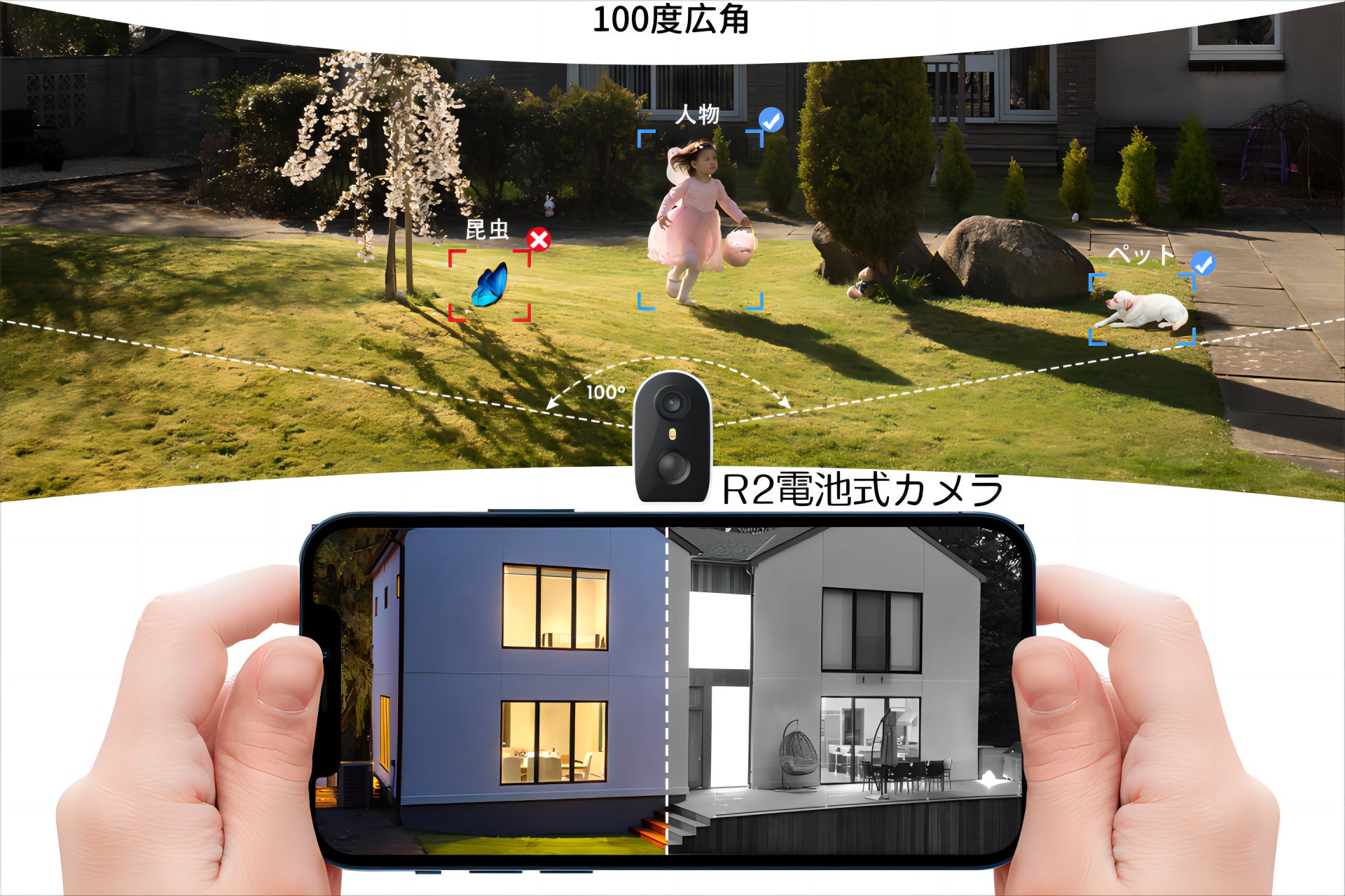 R2カメラは、広い視野角(100°)とスマートなAI機能が特徴です。