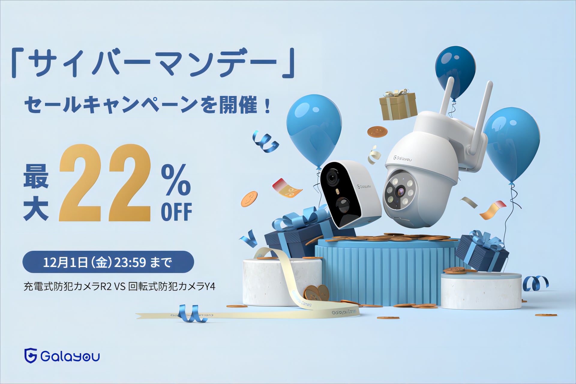 今回のサイバーマンデーセールでは、お買い得で最も人気のある2つのカメラを厳選しました。注目の充電式防犯カメラR2 と回転式防犯カメラY4をご紹介します。 年間最大の値引きイベントをお見逃しなく!