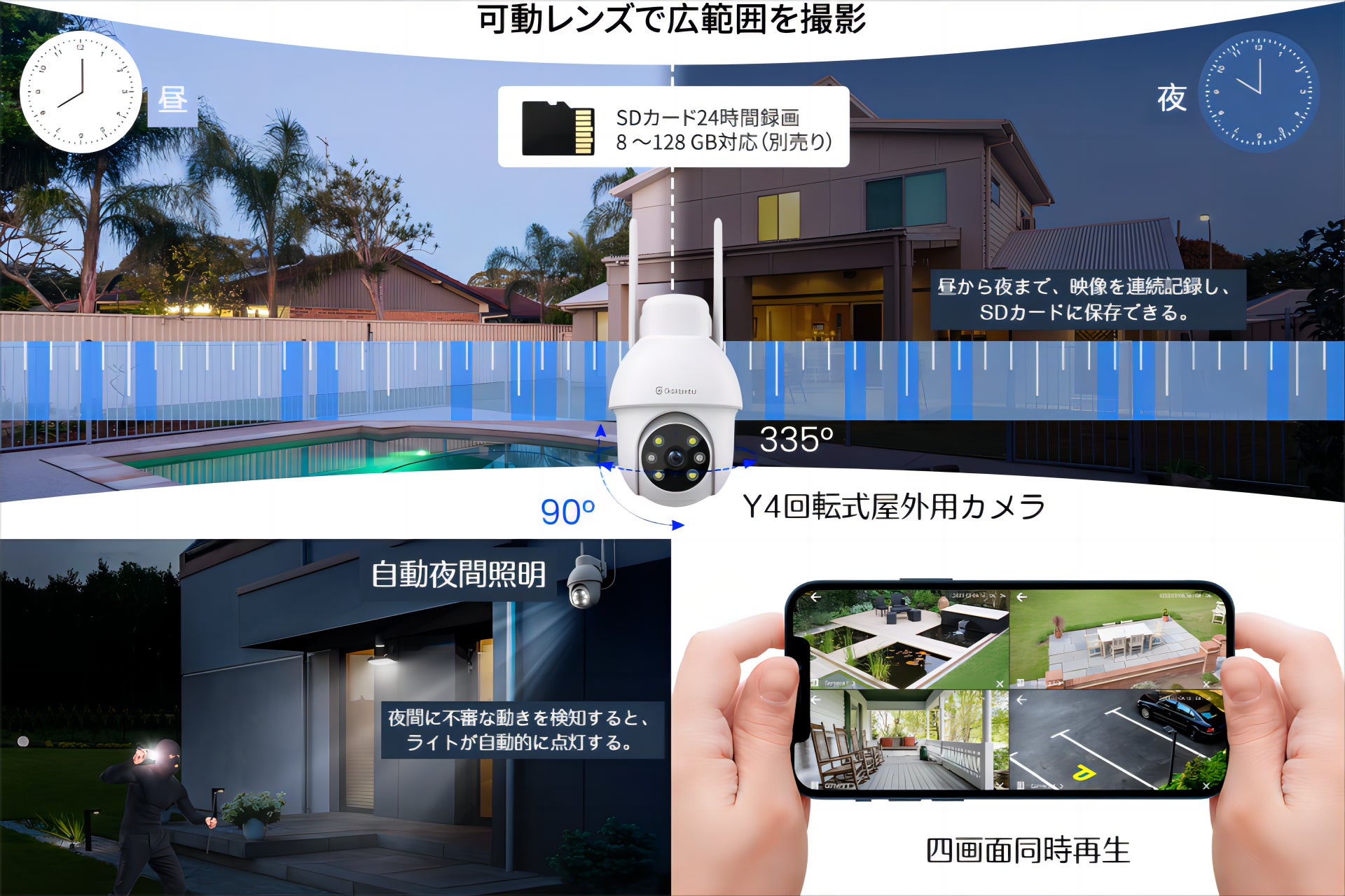 ●回転式防犯カメラY4:防犯カメラだけでなく、自動センサーライト、インターホン、高画質カメラ、録画機も一体