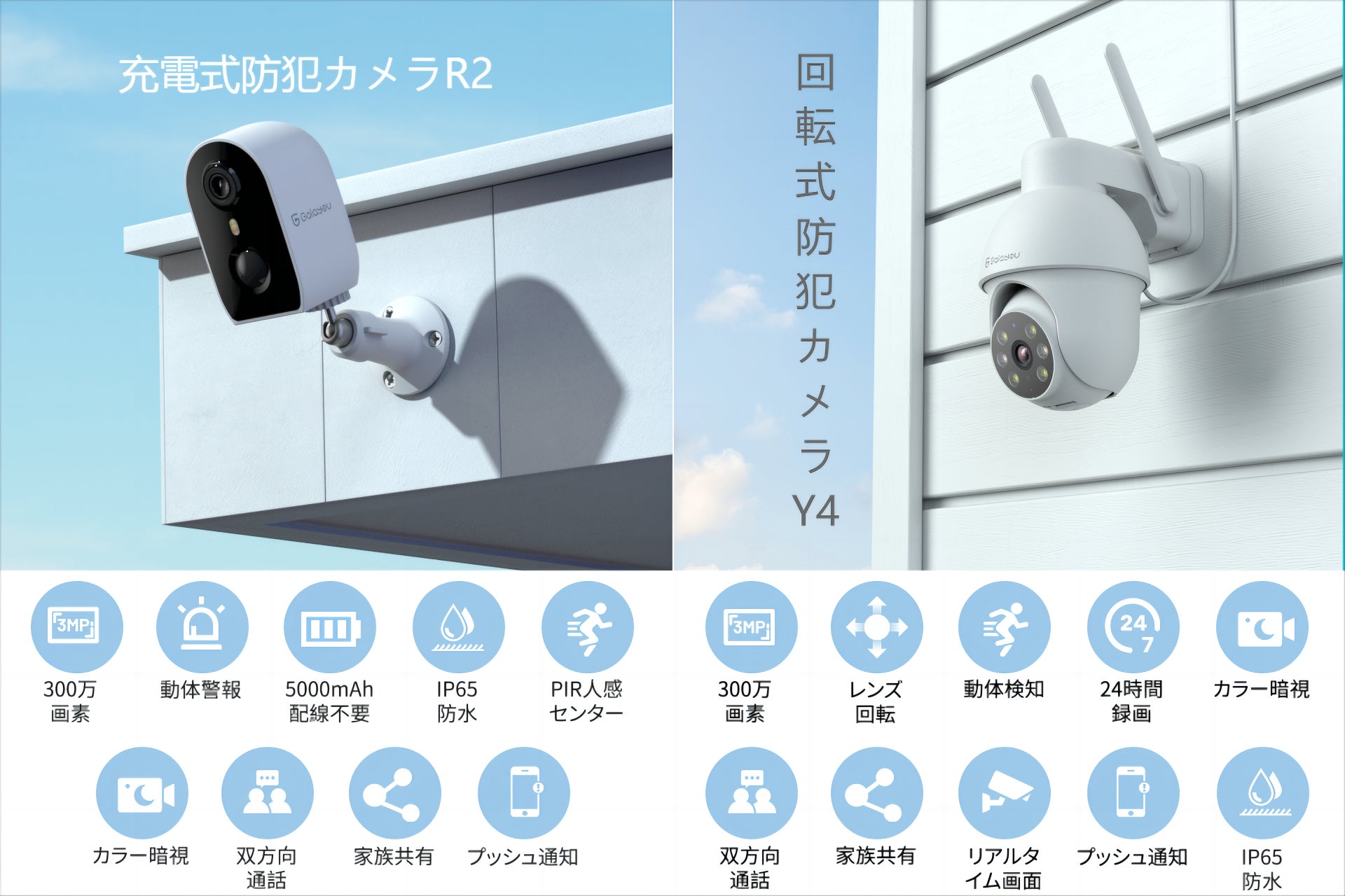 どちらも300万画素の高画質で、夜間でも鮮明で色鮮やかな画像を提供する赤外線ライトと白色ライトを内蔵しており、IP65規格の防塵・防水機能を備えているため、雨天でも安心して見守ることができます。