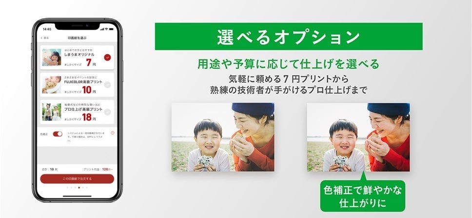 コスパと手軽さが魅力の「しまうまオリジナル」、FUJIFILM社の純正印画紙を使った「FUJICOLOR高級プリント」、熟練の技が光るプレミアム品質の「プロ仕上げ高級プリント」の3種類から、用途に応じて選べます。