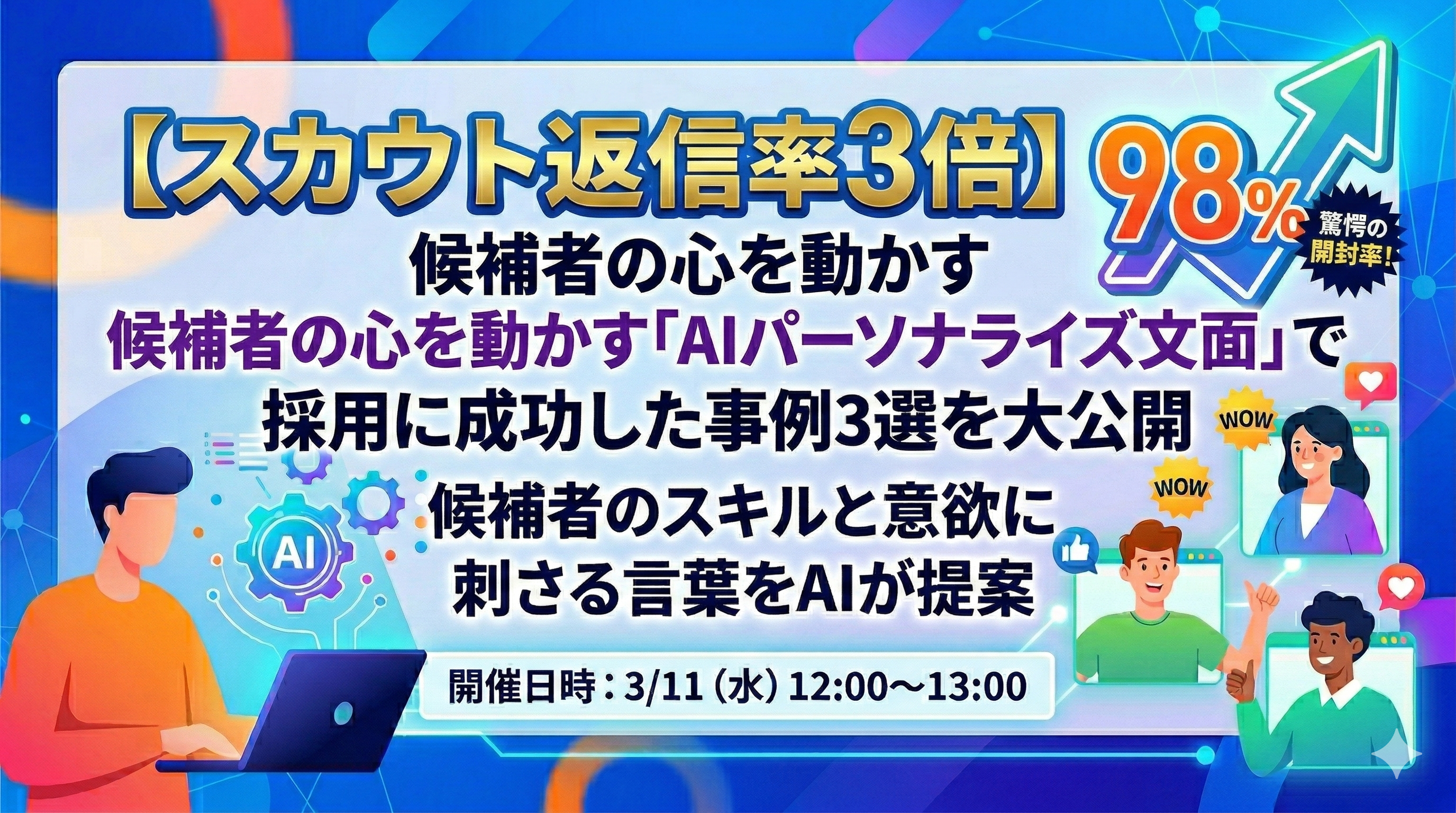 3/11(水)ウェビナー開催-【スカウト返信率3倍】候補者の心を動かす「AIパーソナライズ文面」で採用に成功した事例3選を大公開