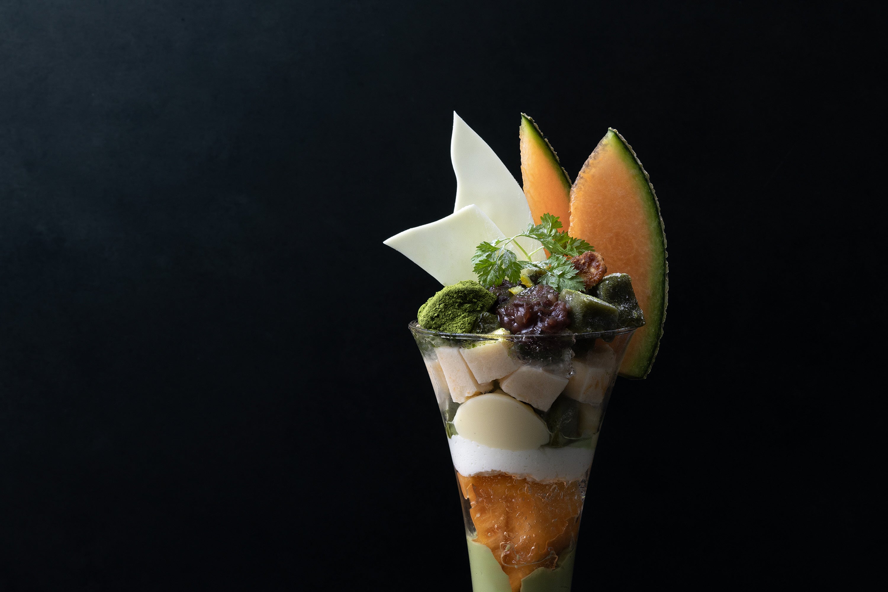 甘くて香り高いメロンと抹茶の調和を感じられるパフェ