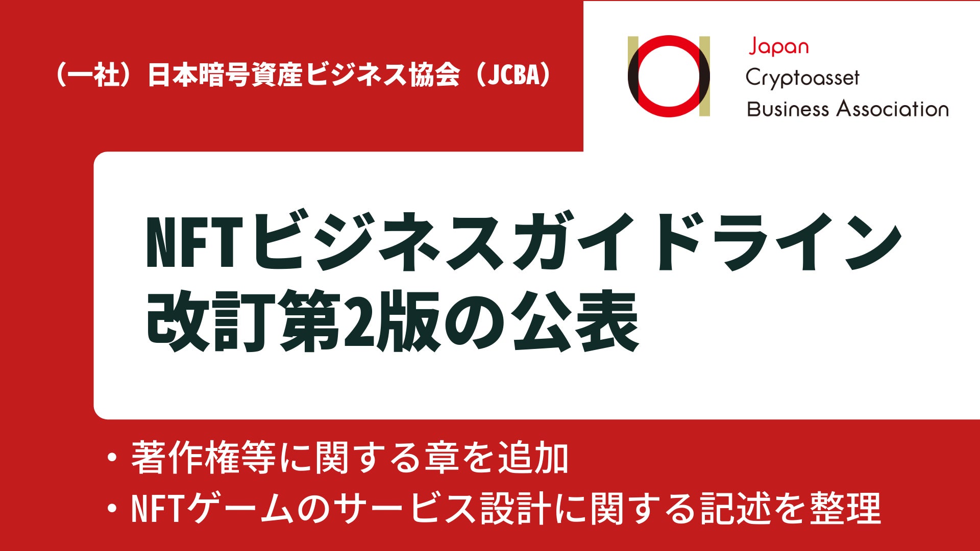 一般社団法人日本暗号資産ビジネス協会(所在地:東京都千代田区、会長:廣末 紀之)は、NFT部会(部会長:天羽 健介)が中心となり、NFT関連ビジネスに関するガイドラインを改訂し、第2版として公表いたしました。