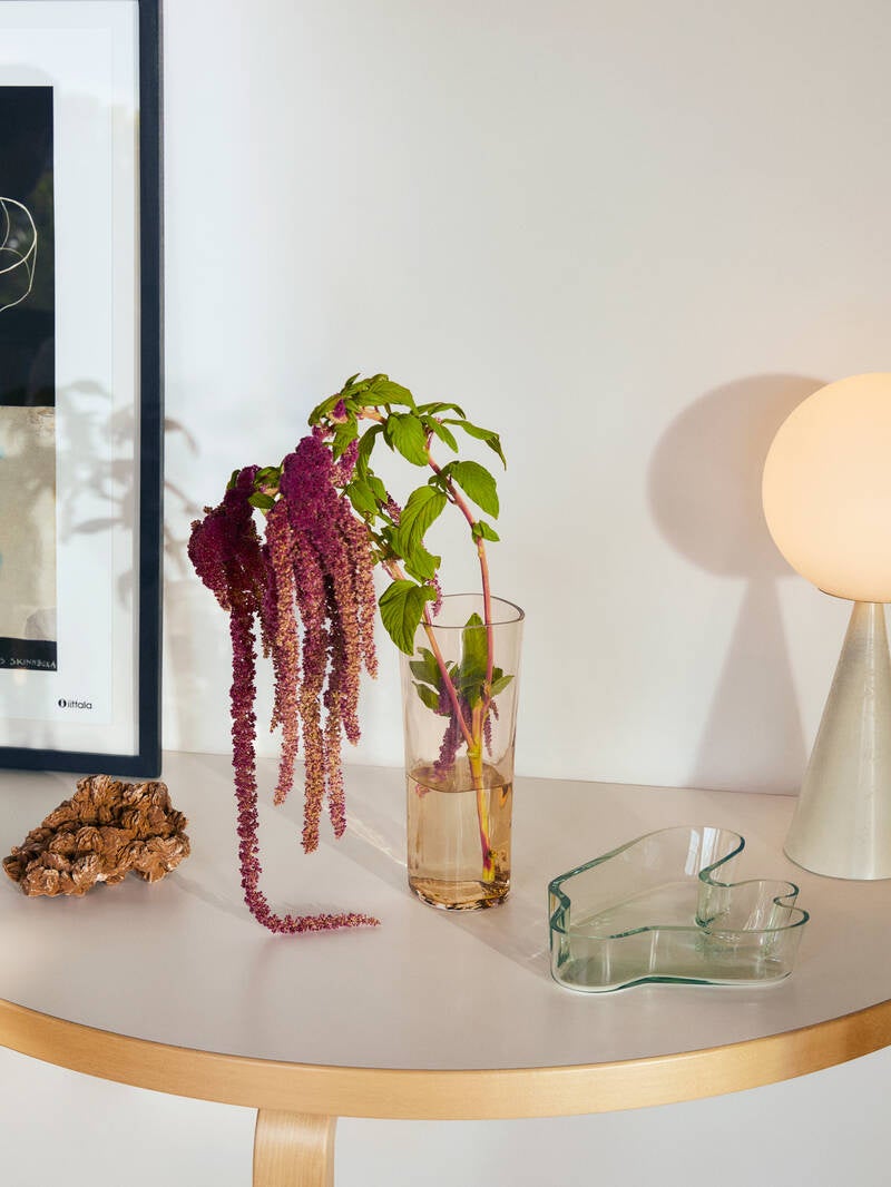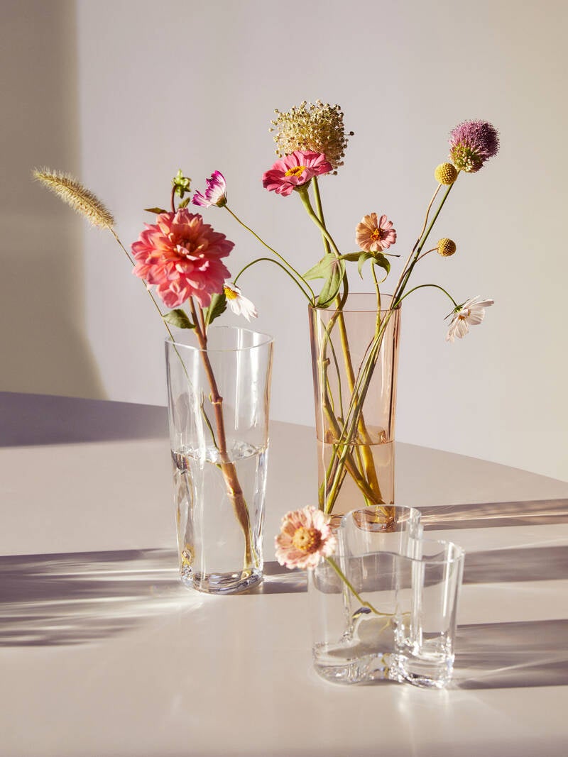 背が高く美しいベース(250mm)は、フィンランドのイッタラガラス工場で木型を使い、手作業で吹き上げられたもの。木型を使うことで、それぞれのベースに独特の手触りと風合いの個性が加わります。リオブラウン、クリア、クリア 1937 の 3 色で登場し、それぞれ2023 個の限定生産。一輪挿しや枝物、背の高いお花を生けるのに最適です。