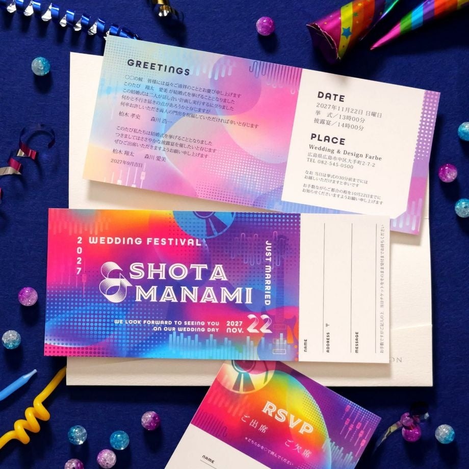 音楽好きのおふたりにはこちらのフェスチケット風招待状がオススメ!近未来的なデザインが手にしたゲストへワクワクを届けてくれそう♪