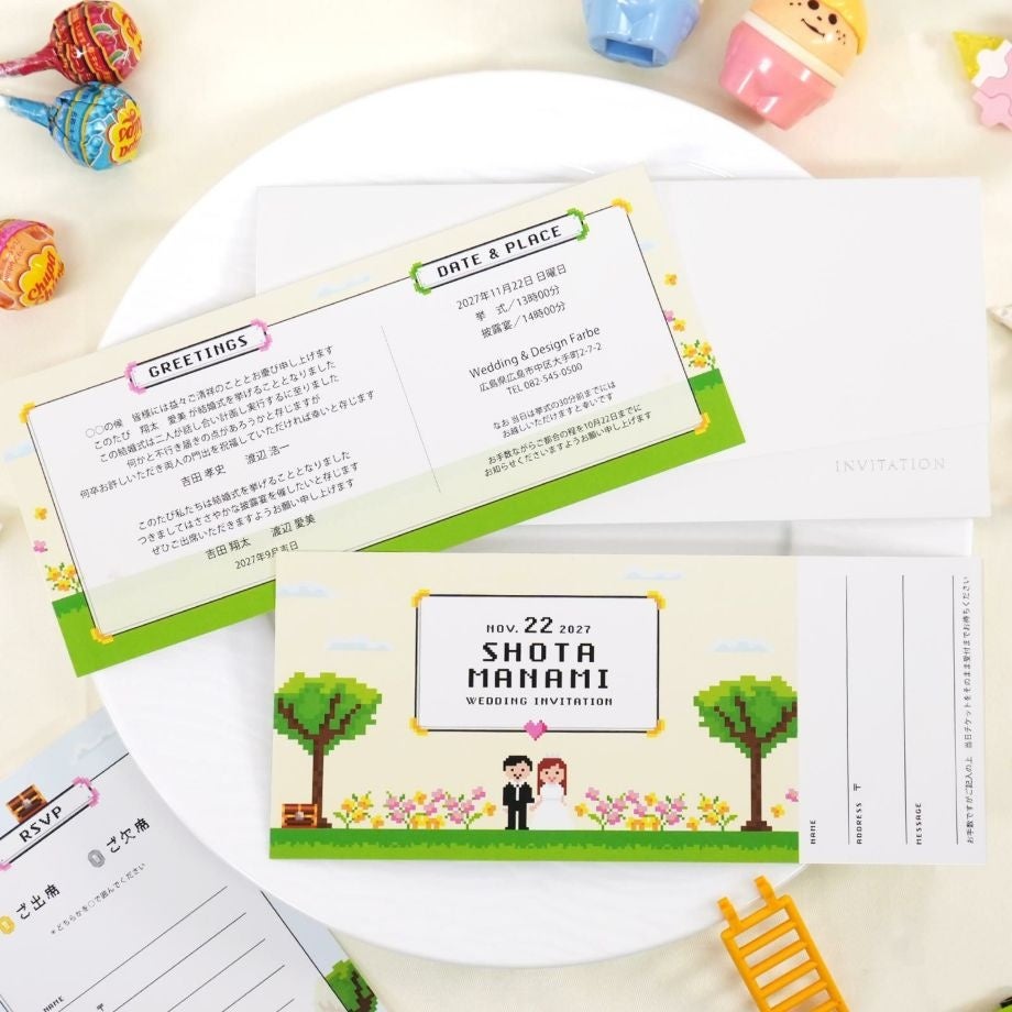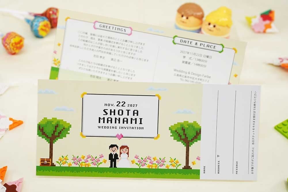 ゲーム好きのおふたりにはたまらない!ゲームキャラ風のピクセルアートのデザインがPOPで可愛い世界観を演出します。