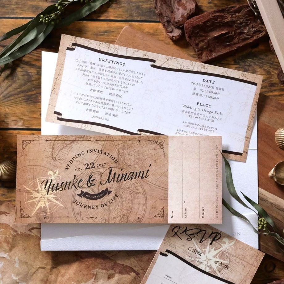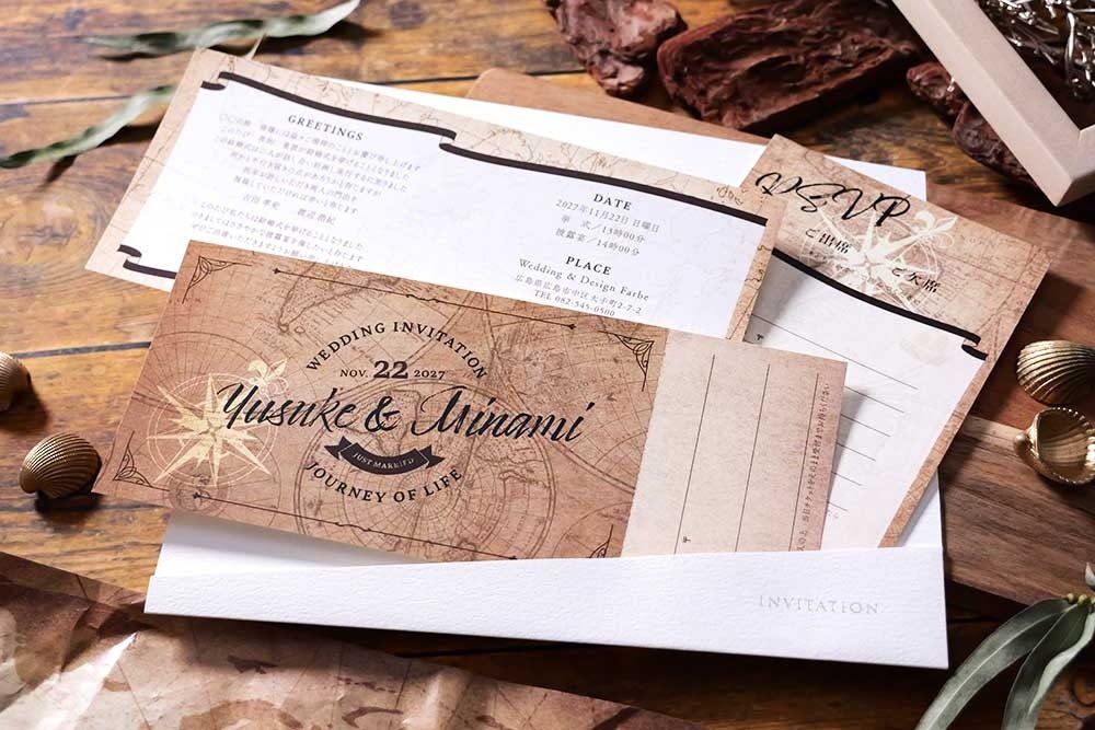 冒険や航海を連想させるヴィンテージライクな世界地図デザインは、旅行好きなお二人にピッタリ!落ち着いたセピアカラーと洗練されたデザインが大人ウェディングにも合いますね。