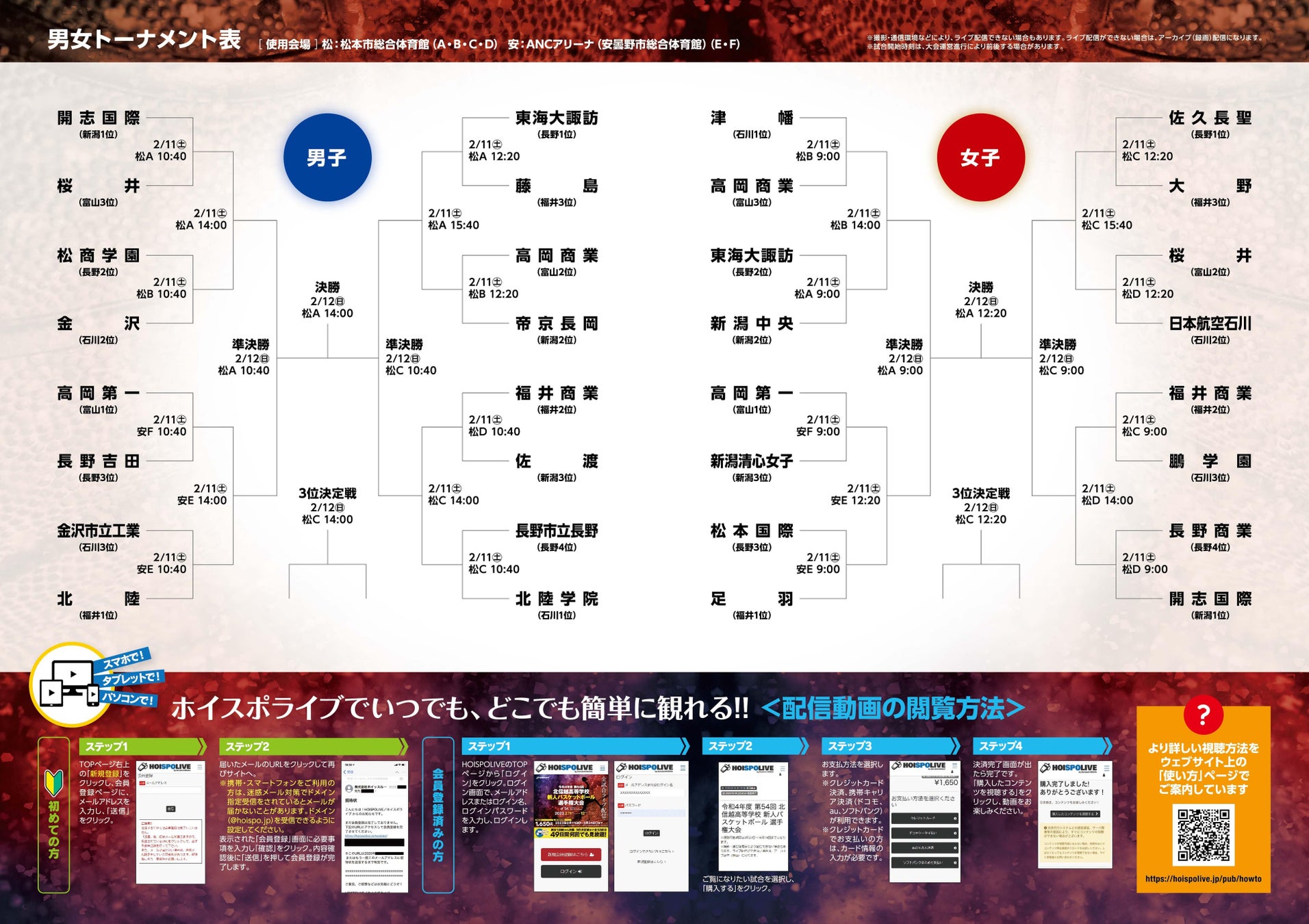 3年生が引退して新チーム発足後、初の北信越大会を会場へ応援に行けない保護者や関係者の皆様のご要望に応えるべく男女1回戦から決勝までの全32試合をライブ配信及び見逃し配信(アーカイブ)いたします。