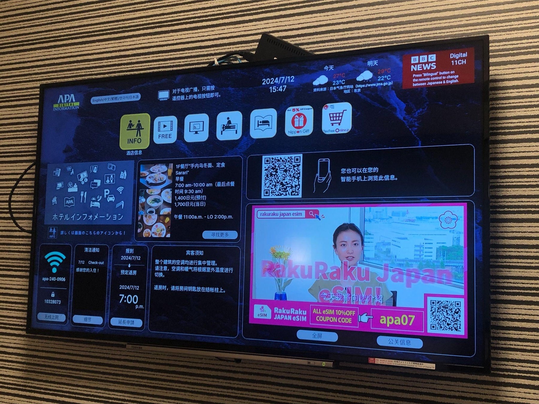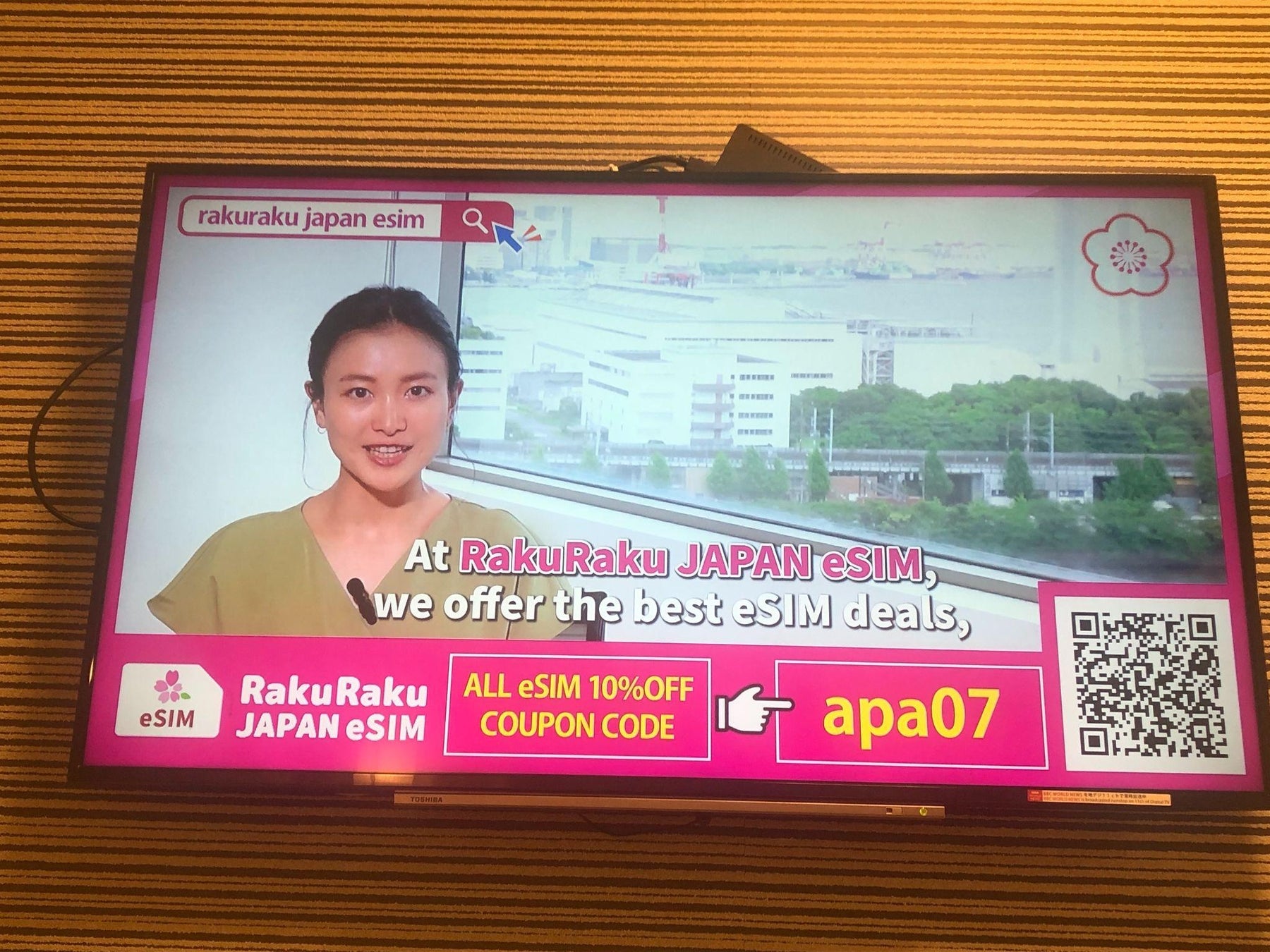 朝日放送グループの株式会社ABCフロンティア(本社:東京都港区 代表取締役社長:後藤利一 以下「ABCフロンティア」)と、ホテル向けIoTソリューションを提供するブリッジ・モーション・トゥモロー株式会社(本社:東京都品川区 代表取締役社長:島本茂弘)が共同運営する、ホテルの客室内テレビを活用したインバウンド プロモーションメディア「おもチャンネル・インバウンド」で、株式会社ワイヤレスゲート(本社:東京都品川区 代表取締役CEO:成田 徹)様が提供するインバウンド向けeSIMのECサイト「RakuRaku JAPAN eSIM」のCMを配信しました。