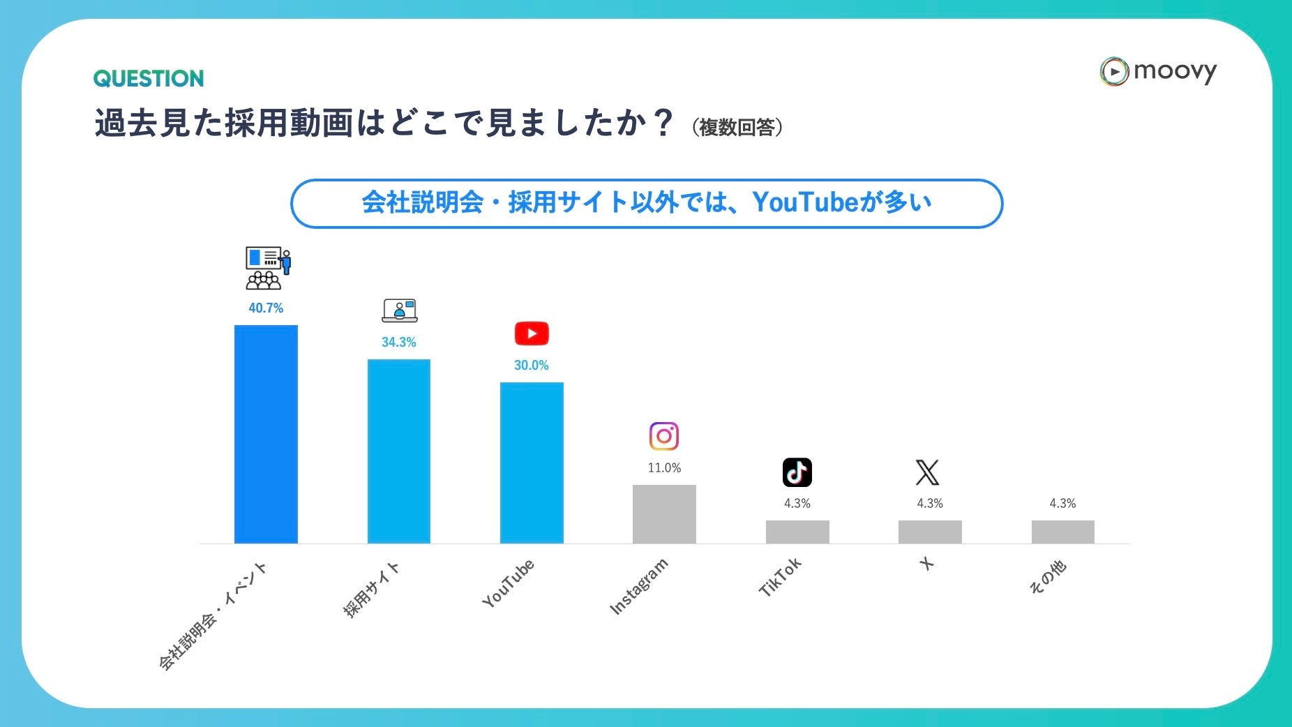 この結果から採用動画のプロモーションやコンテンツの改善が必要であることを示しています。企業は、採用動画の露出を高め、魅力的なコンテンツを提供することで、求職者に対する企業の魅力を効果的に伝えることができます。