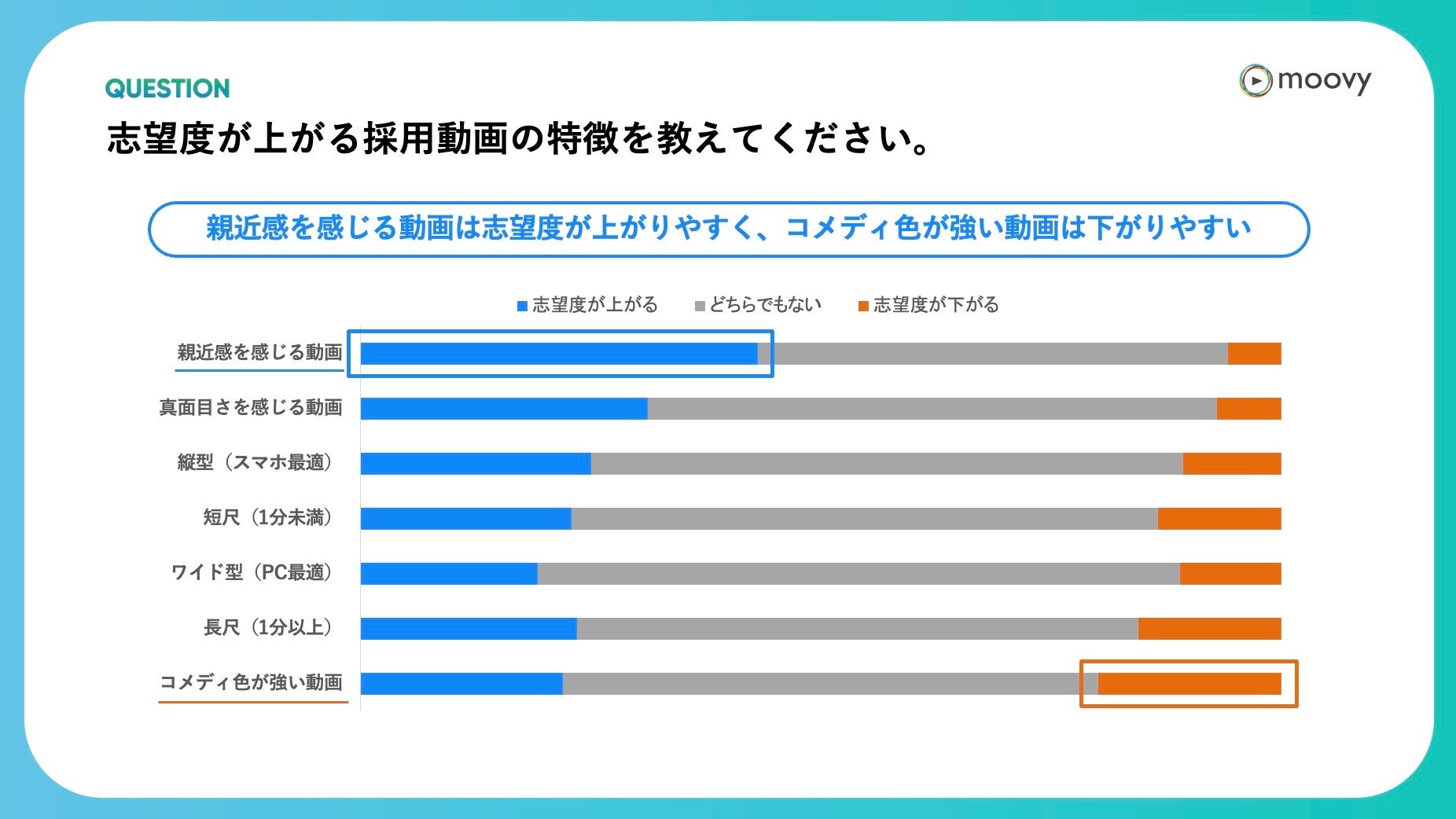 一方で、コメディ色のある動画は求職者の志望度を下げる傾向にあるため、動画制作においては、親近感を出しながら、コメディ色を抑えることが大事だといえます。