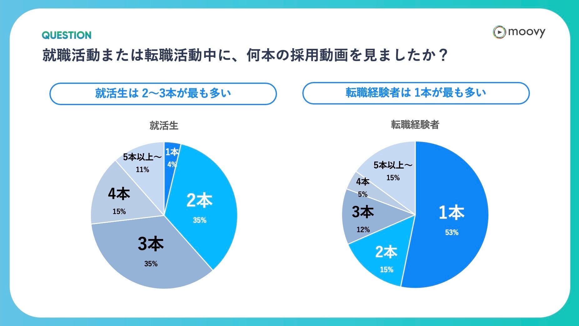 転職経験者は、「1本」という回答が半数でしたが、就活生は2〜3本が最も多い結果となりました。一方で、5本以上の採用動画を視聴した方もおり、多くの企業を比較・検討していることを示しています。求職者は複数の企業の情報を収集し、自分に最適な職場を見つけるために時間と労力をかけていることが伺えます。