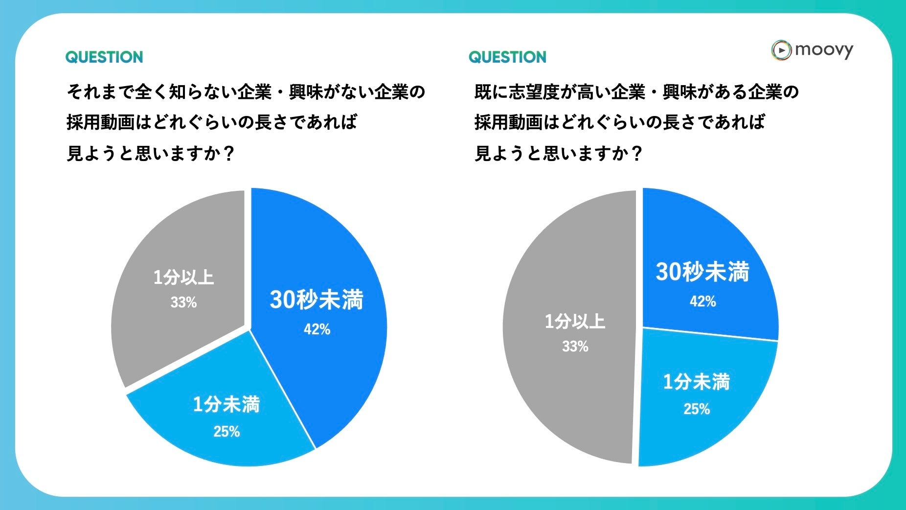 求職者が既に興味を持っている企業の採用動画でも、短時間で要点を押さえた動画が求められているということは、最近の求職者が情報を迅速に得たいというニーズを反映しています。5分を超えるような長尺の動画コンテンツではなく、直感的に訴求するコンパクトな動画尺が効果的だと考えられます。