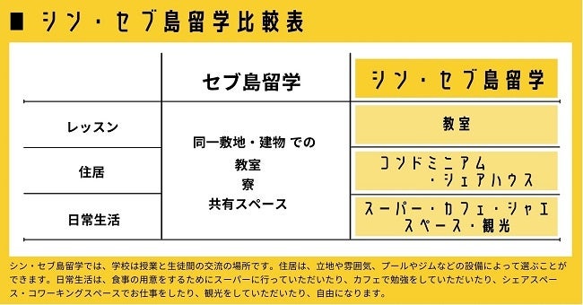 これまでのセブ島留学は、語学学校の敷地内、もしくは語学学校の建物内に教室と寮が設置され、留学生活のほとんどの時間を同じ環境で過ごすという内容でした。