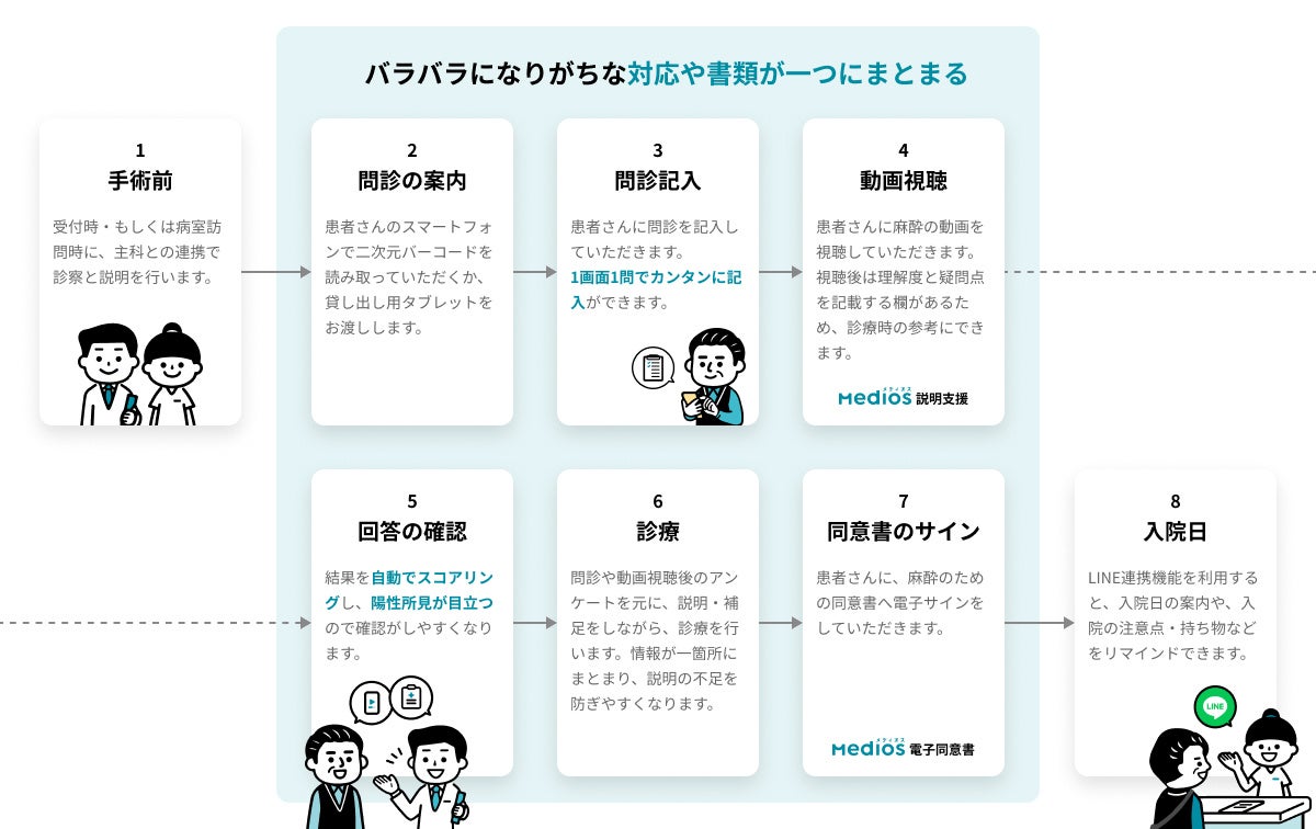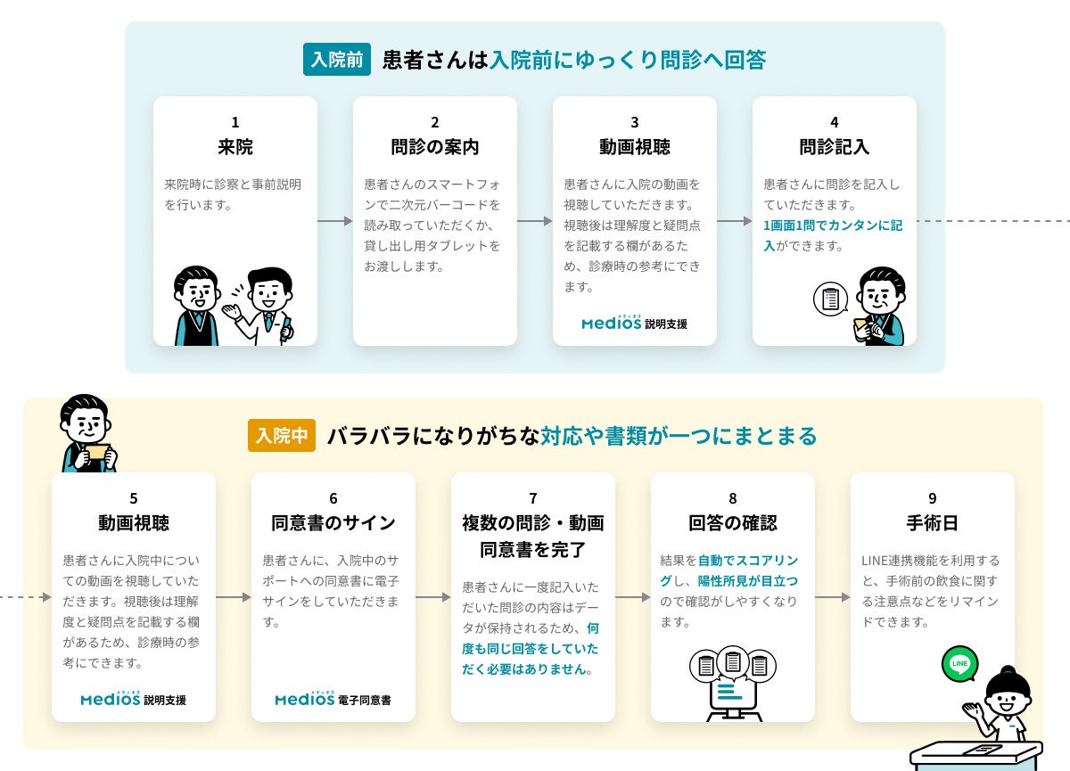 コントレアでは「MediOS アナムネ/問診票」のほか、「MediOS 説明支援(※3)」や「MediOS 電子同意書(※4)」といったサービスを提供しています。これらのサービスを組み合わせることで、周術期のフロー全体で問診、説明(インフォームドコンセント、入院説明など)、さらには同意書の取得までMediOSで完結することが可能です。