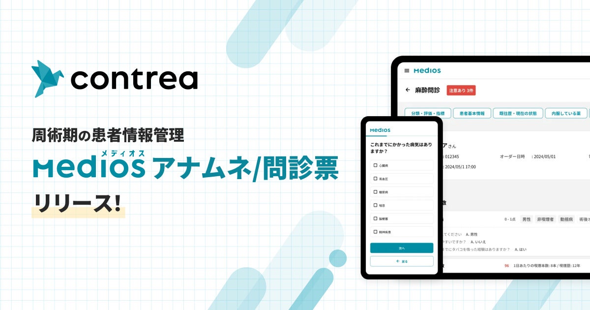 医療者と患者さんをつなぐ外来DXプラットフォーム『MediOS(メディオス) 』を提供するContrea株式会社(本社:東京都渋谷区、代表取締役:川端一広、以下「コントレア」)は、問診票をWeb上で収集・管理する「MediOS アナムネ/問診票」を正式にリリースしたことを発表します。