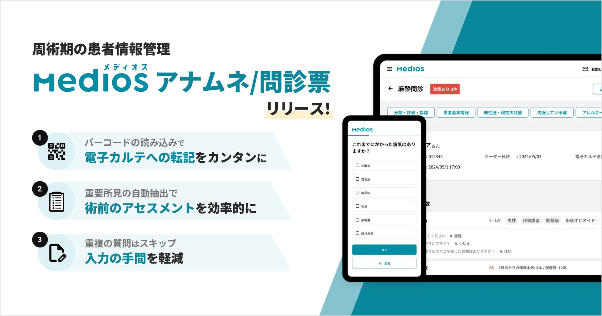 「MediOS アナムネ/問診票」は、周術期における患者さんの情報収集及び管理の作業を効率化することに特化した院内DXサービスです。周術期に必須となる患者さんの情報をデジタルで管理し、医療者が患者さんの重要な情報を漏れなく簡単に管理することが可能です。