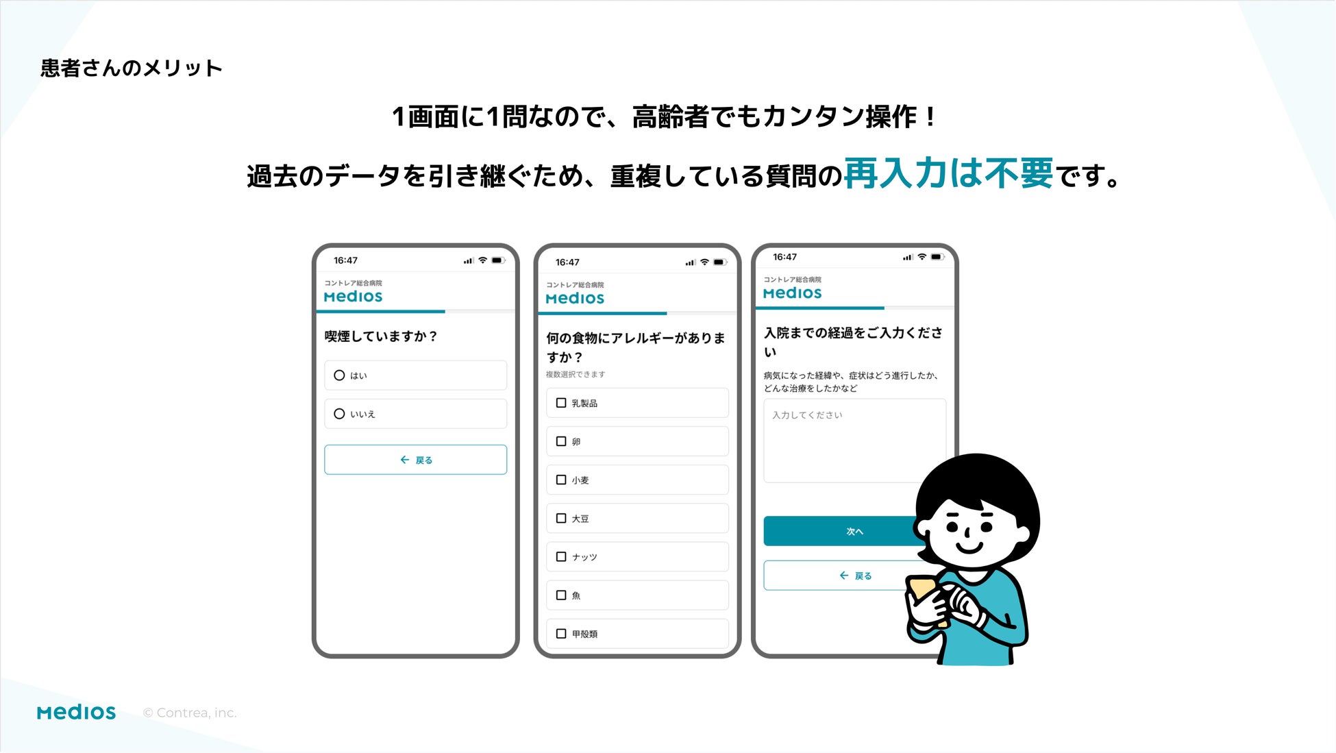 前述の周術期における情報収集と管理の課題を解決するため、コントレアは「MediOS アナムネ/問診票」をリリースしました。