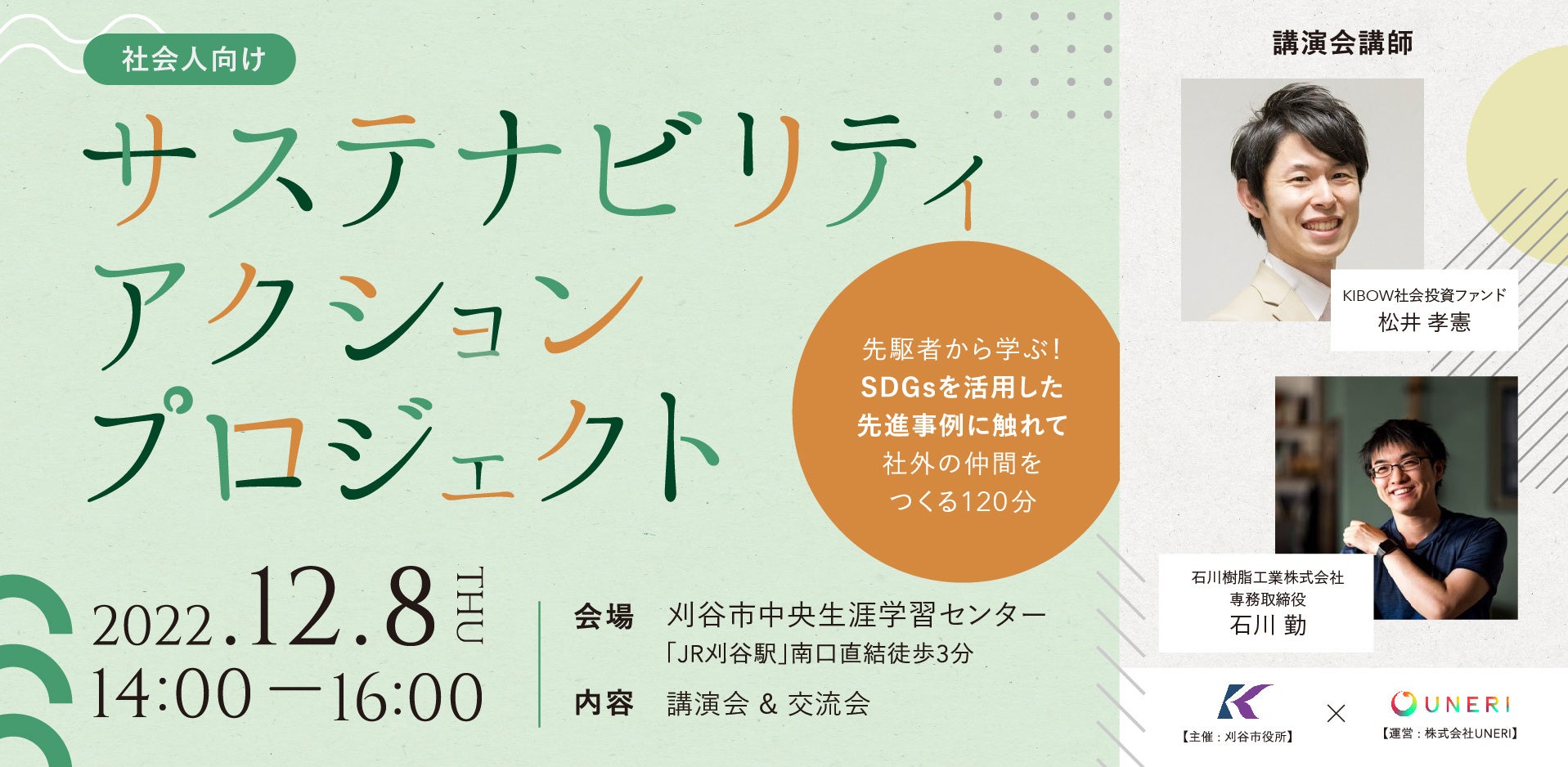 東海地域から社会起業家のエコシステム発展に向けた事業を展開する「株式会社UNERI」(本社:愛知県名古屋市 代表取締役 :河合将樹)は、刈谷市主催事業として開催する「サステナビリティ・アクションプロジェクト」にて運営事務局を務めます。