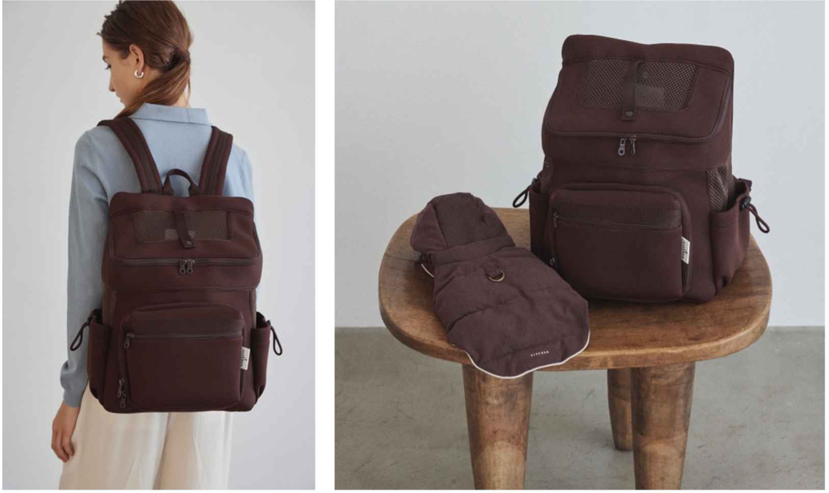 今回新色を発売する「ネオプレーンバックパックキャリー」は、“丸洗い”できることが特徴のブランド立ち上げ当初からの大人気商品です。クッション性の高い肩紐で負担が少なく、コンパクトな見た目ながら、愛犬が中でゆっくりとくつろげる設計になっており、バッグひとつで安心して愛犬とお出かけできる大容量ポケットが付いていることもこだわりのひとつです。上部のフタにはメッシュが付いており、公共機関での移動にもお使いいただけます。また、フタを使用しない際は専用の留め具でフタを固定し、愛犬のお顔を出してのお散歩も可能です。