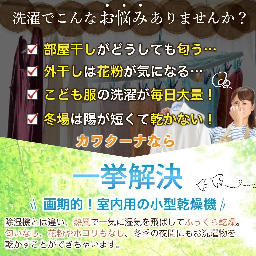 そんな想いから、日本中のお母さん達の「洗濯物を干して乾かす」大変さを解消したいと、 主婦目線で新製品の開発に取り組み、生まれたのが室内用小型乾燥機「カワクーナ」です
