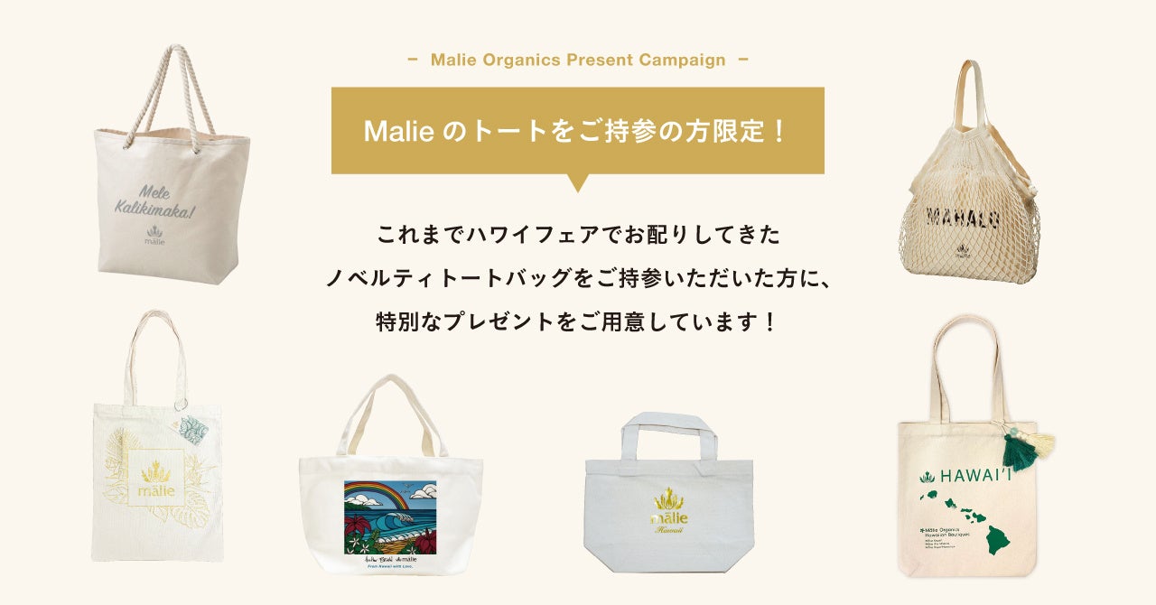 また会場では、2019年~2024年に全国のハワイフェアでお配りしてきたMalie Organicsのノベルティトートバッグをご持参いただいた”Malie Lover”なお客様に、ささやかなギフトをご用意します!ぜひお気に入りの1枚を持ってお越しくださいませ。