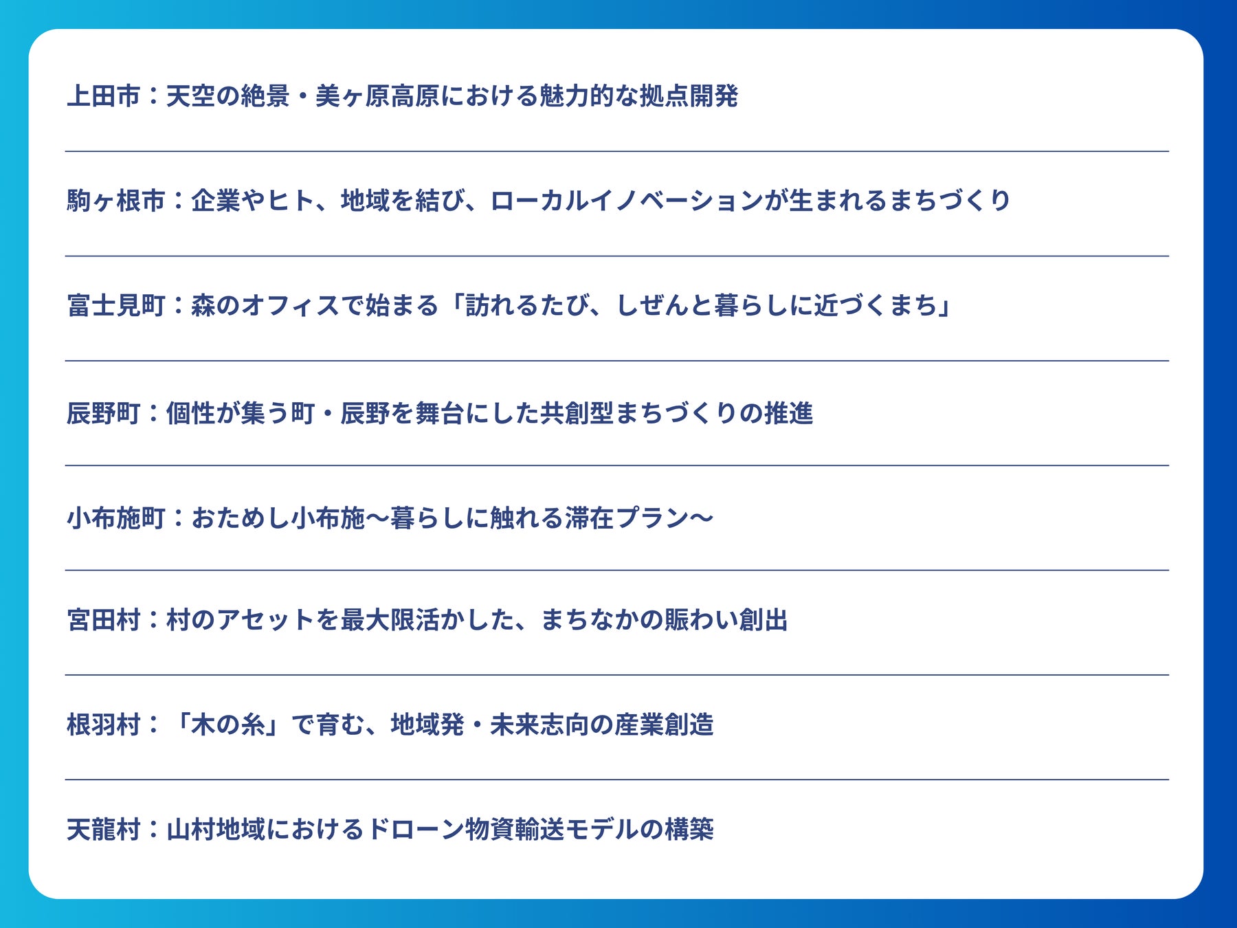 以下の公式サイトより、市町村のテーマ概要と、企業からの応募を受け付けています。