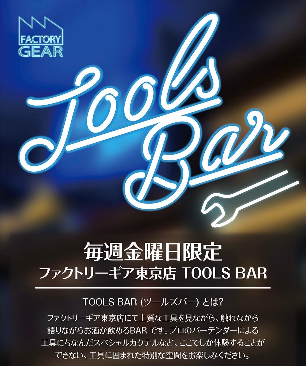 さらに隣接しているファクトリーギア東京店では、店内に設置された「TOOLS BAR」で特製カクテルの販売も行うので、お酒を楽しみながら22時までお買い物が楽しめる。