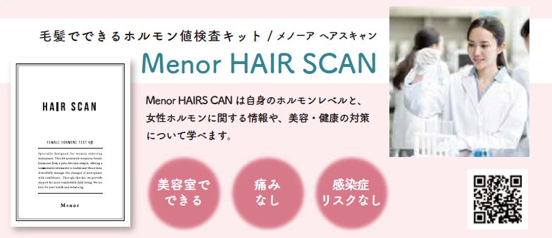 「Menor HAIR SCAN」は、毛髪を用いたホルモン検査キットです。婦人科に行かなくても自身の女性ホルモン量を手軽に検査することが可能です。液体クロマトグラフィーを使用し毛髪中のプロゲステロン量を数値化し、女性ホルモンレベルを4段階で判定します。また検査結果に応じた健康管理のアドバイスや専門家への相談サービスも提供しています。