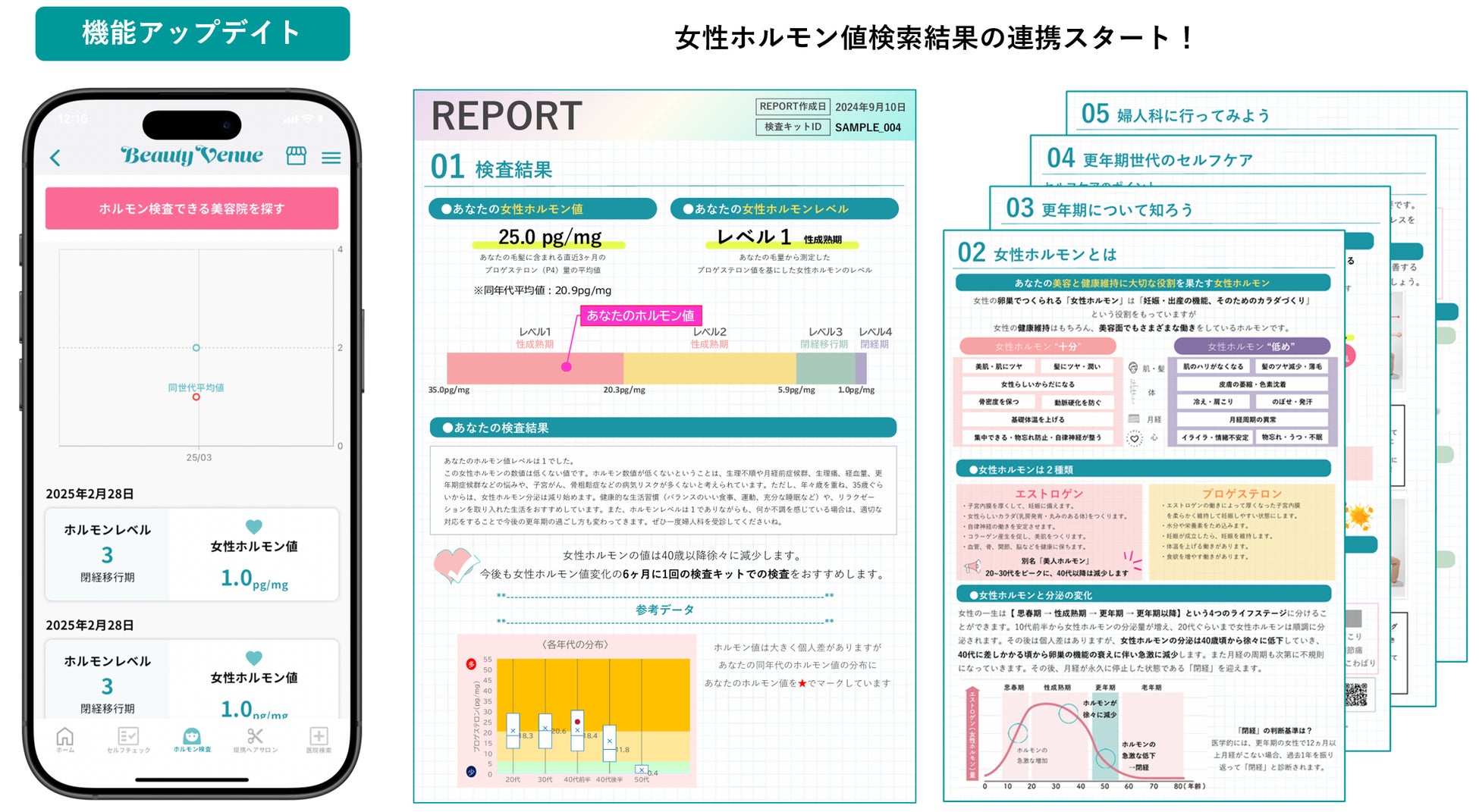 美容室と婦人科を繋いだ更年期エコシステムを展開する日本美容創生株式会社(本社:東京都千代田区、代表取締役:金山宇伴氏、以下「日本美容創生」)は、更年期症状をやわらげるお手伝いをするアプリ「Beauty Venue(ビューティー ベニュー)」の機能アップデートを行い、2024年11月から全国美容室で順次導入が開始された “美容室でできる「女性ホルモン値検査キット」” との連携を開始したことをお知らせいたします。