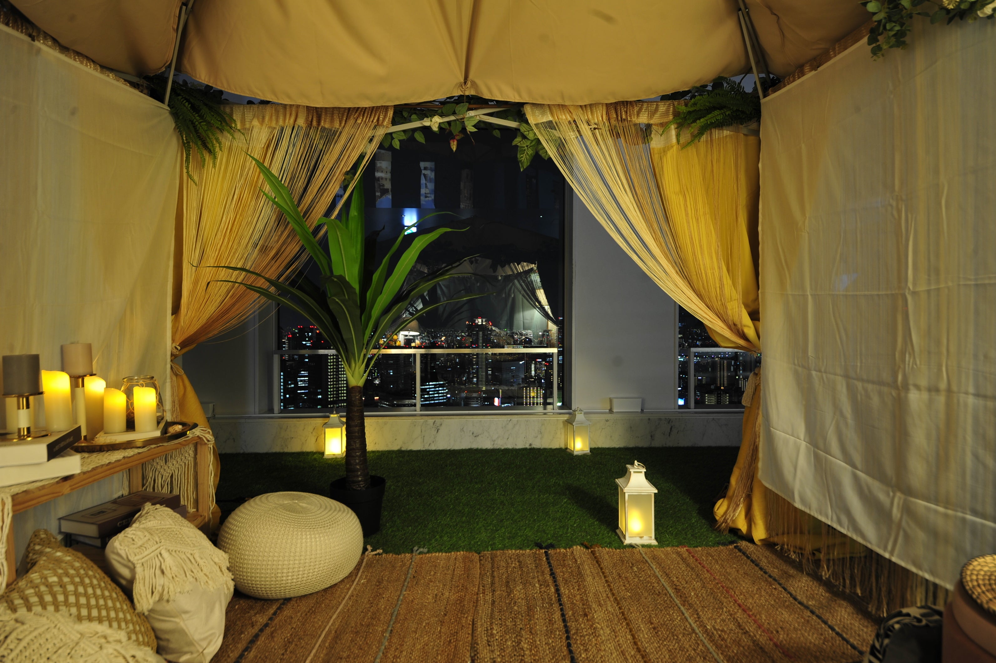 【空中庭園展望台】地上173mの空の上、完全予約制のビーチテントでリゾート気分満喫!トロピカルカクテルやオリジナルビーチサンダルにハートロックも付いた大満足のプランを販売中。