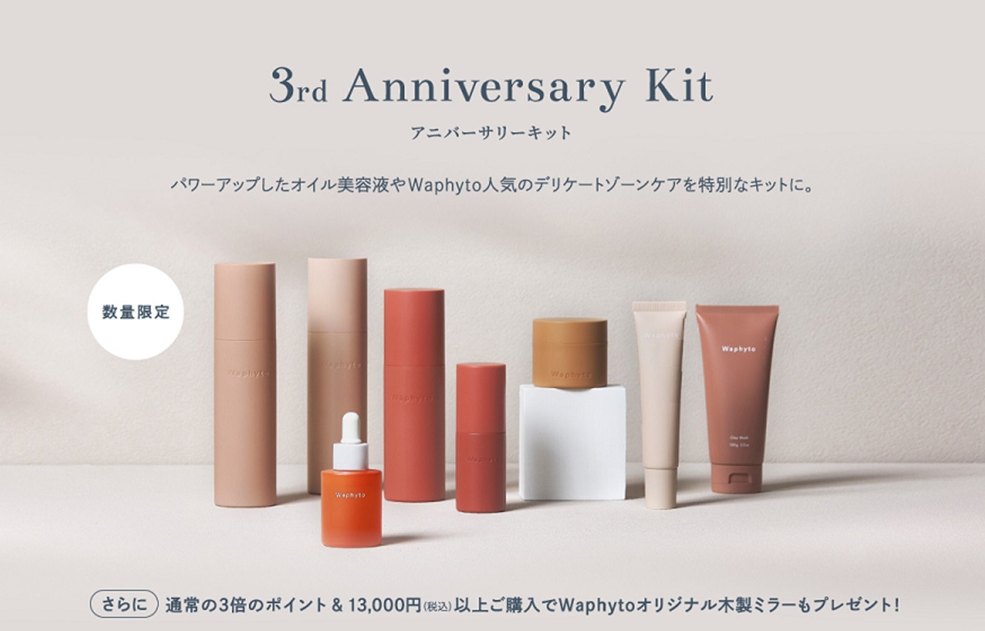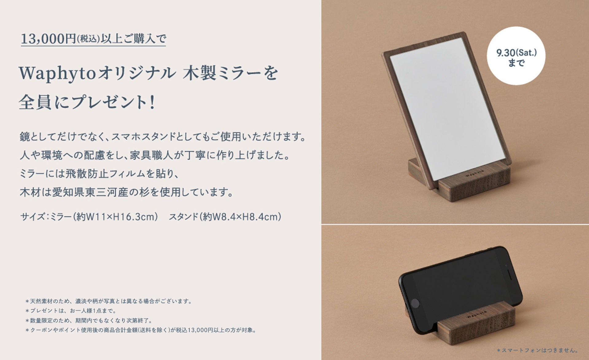 Waphytoは9月で3周年を迎えました。感謝の気持ちを込めて、Waphyto公式オンラインストア・直営店舗ではプレゼントキャンペーンを開催いたします。税込13,000円以上ご購入で、オリジナル「木製ミラー」をプレゼント!