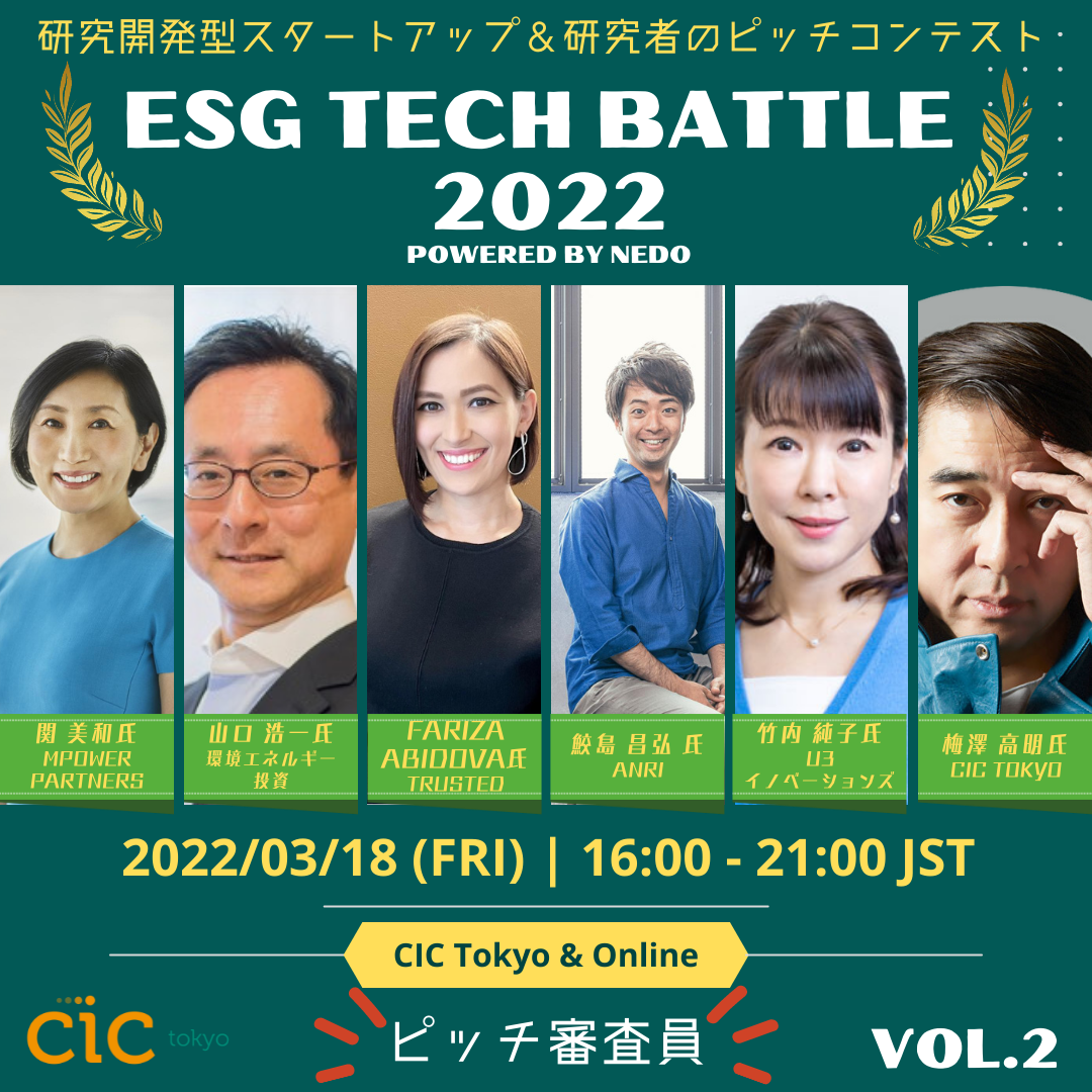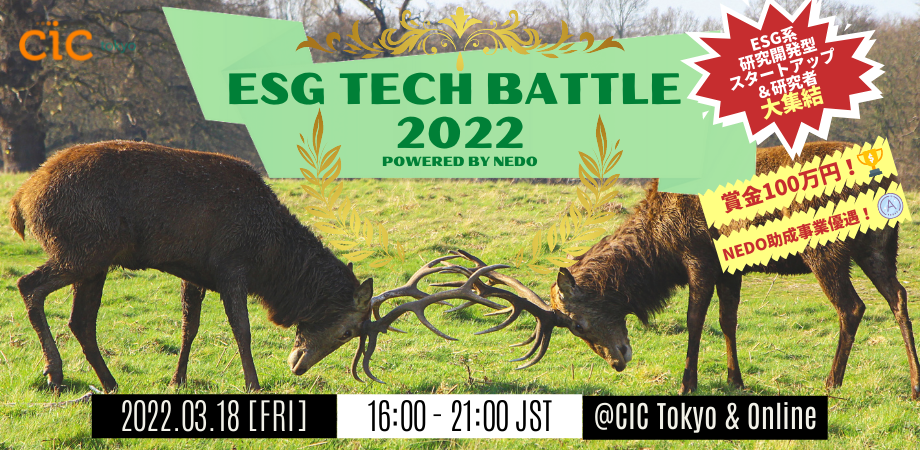 ESG TECH BATTLE 2022は、NEDOが2021年度に新たに創設した、プレシード・シード期の研究開発型スタートアップ、研究者、起業家のためのピッチコンテストです。対象は環境エネルギー分野を中心としたESG関連領域であり、最優秀賞として経済産業省産業技術環境局長からの賞&賞金100万円、優秀賞としてNEDO賞、そして入賞者にはCIC会長賞が授与されます。また、受賞者にはCIC Tokyoより事業成長サポート1年分が提供されます。