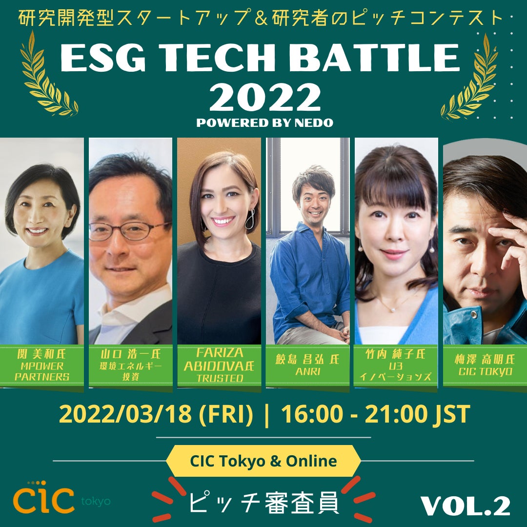 ESG系研究開発型スタートアップ&研究者のピッチコンテストを3月18日に開催 !ESG TECH BATTLE 2022 powered by NEDOのファイナリスト20名が決定