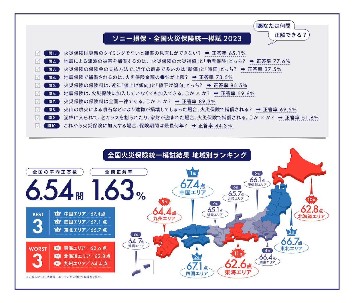 「ソニー損保・全国火災保険統一模試 2023」の結果、全10問の平均正答率は65.4%、全問正解の“火災保険マスター”は1,100名中わずか18名の1.63%となり、火災保険に関してまだまだ正しい知識が浸透していない実態が明らかになりました。加えて、全国11エリア中で最も正答率の高いエリアが中国地方(67.4%)、最も低いエリアは東海地方(62.6%)となっており、地域によって正答率に差が出る結果となりました。
