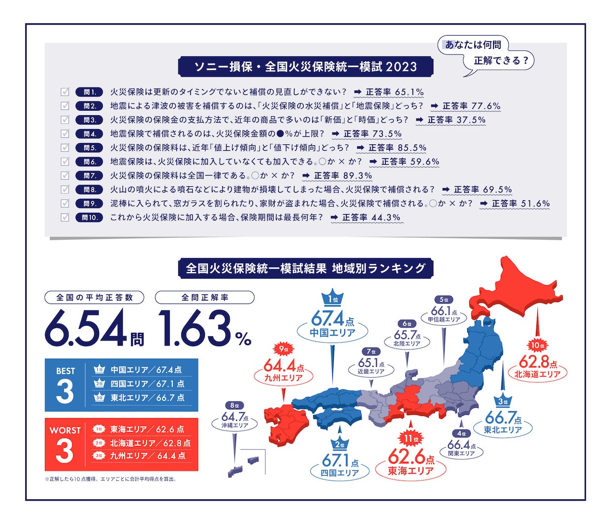 「ソニー損保・全国火災保険統一模試 2023」を実施 全国11エリア別ランキングでは中国エリアが1位を獲得! 〜全問正解の火災保険マスターは日本全国1,100名中わずか18名!?〜