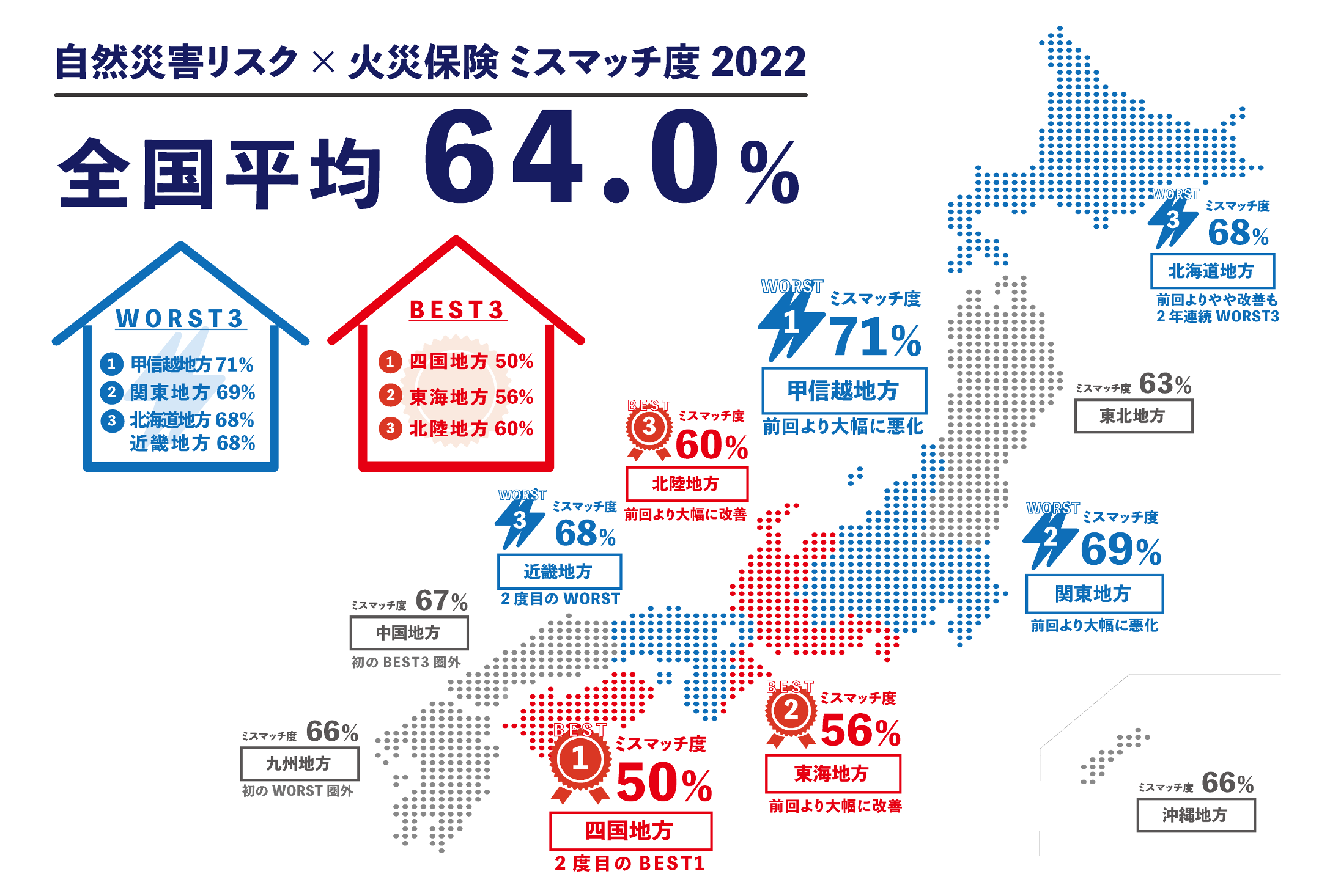 ソニー損保は、全国の持ち家家庭に対して、自然災害リスクと火災保険に関する意識調査を2020年から3年連続で実施しています。2022年の調査(※2)では、全国の6割(64.0%)を超える世帯で居住エリアの自然災害リスクと火災保険の補償内容にミスマッチが発生していることが判明しています。地域ごとの傾向について本調査と比較すると、全国11エリアのうち、最もミスマッチが少なかった四国は、今回の調査でも平均点が高く、2位にランクインしました。一方、10問ある設問のうち正答率最下位が最も多かった北海道は、実際にミスマッチが多く発生しているという結果が出ています。