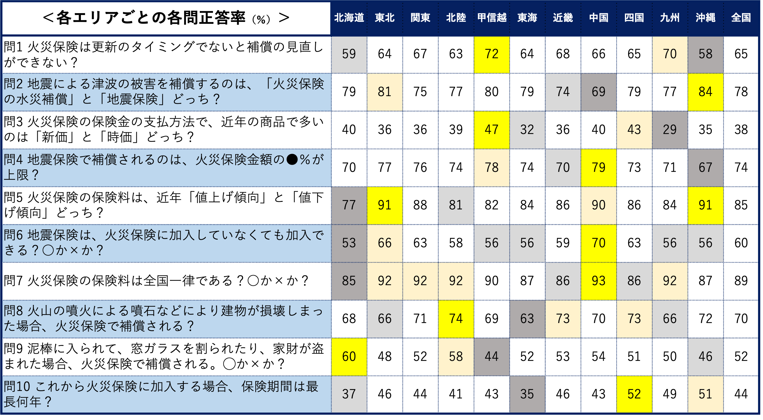 ●北海道エリア 正答率最下位が全エリア中、最も多い3問という結果に。そのうち2問は、火災保険料に関する問題であった。 | ●甲信越エリア 10問のうち全国の正答率が 一番低かった保険金の支払方 法に関する問題で正答率1位。しかし盗難補償に関する問題では正答率が全エリア中最下位。 | ●四国エリア 平均点が高い水準にある。全エリアで正答率が低い火災保険の保険期間に関する問題では正答率1位を獲得。 |