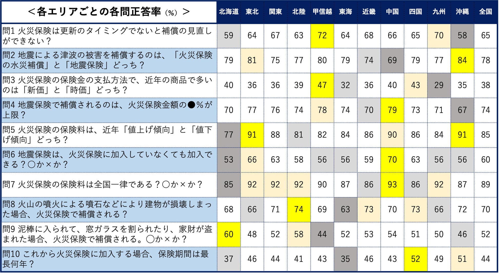 最も正答率が高かったのは「甲信越」エリア(72%)。甲信越エリアは、2004年に新潟県中越地震が起きた地域であり、それ以降も地震が多く発生しています。また直近では、石川県で発生した震度6強の地震が記憶に新しく、地震が多発しているエリアだからこそ日常的に火災保険の見直しを検討している方が多いことが考えられます。