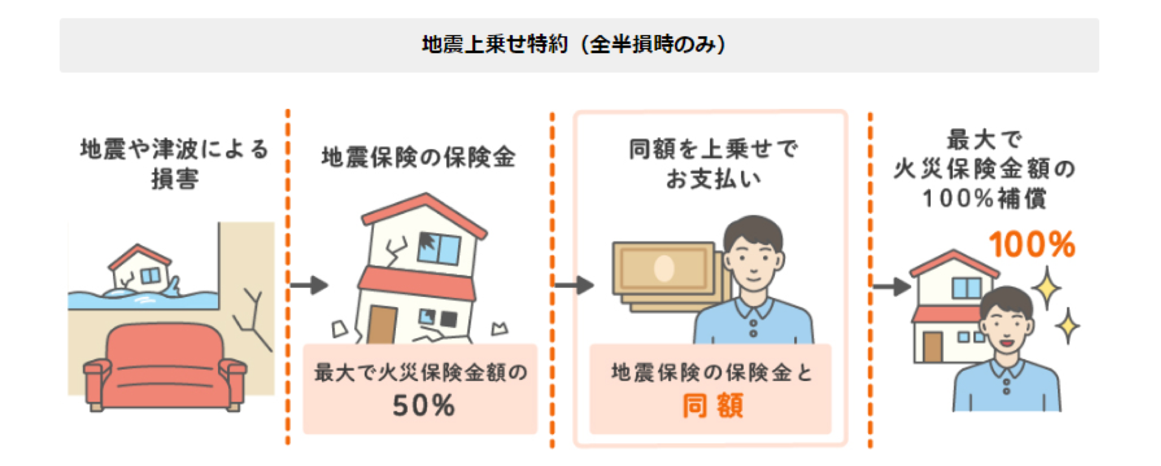 地震保険で補償される金額は、最大でも火災保険の保険金額の50%となっていますが、ソニー損保の新ネット火災保険では、「地震上乗せ特約(全半損時のみ)」(※4)をセットすることで最大100%(火災保険に対して)の補償にすることが可能です。