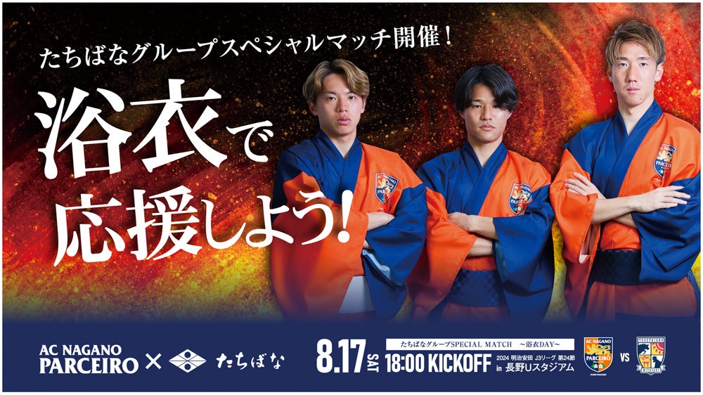 きもの総合小売サービス企業の株式会社たちばな(本社:長野県長野市、代表取締役社長:松本亮治)では、AC長野パルセイロのブロンズスポンサーとして、2024年8月17日(土)18:00キックオフ 長野Uスタジアムにて『たちばなグループSPECIAL MATCH ~浴衣DAY~』を開催します!