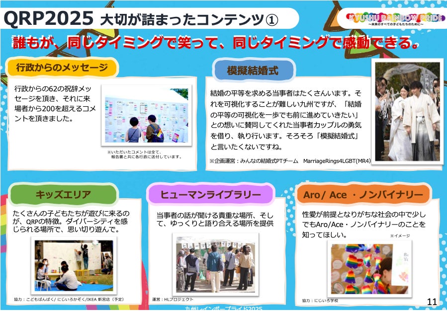 QRPの大きな特徴のひとつは、多くの子どもたちが参加している点にあります。QRPのメインテーマは、「未来のすべての子どもたちのために」。LGBTQ+当事者の多くが、幼少期や性に目覚める時期に苦しさを感じることがあります。そのような困難が少しでも軽減されるようにとの願いを込め、また、当事者に限らず、すべての子どもたちの健やかな成長を願って、このテーマを掲げています。この思いは、QRPの根底に一貫して流れています。