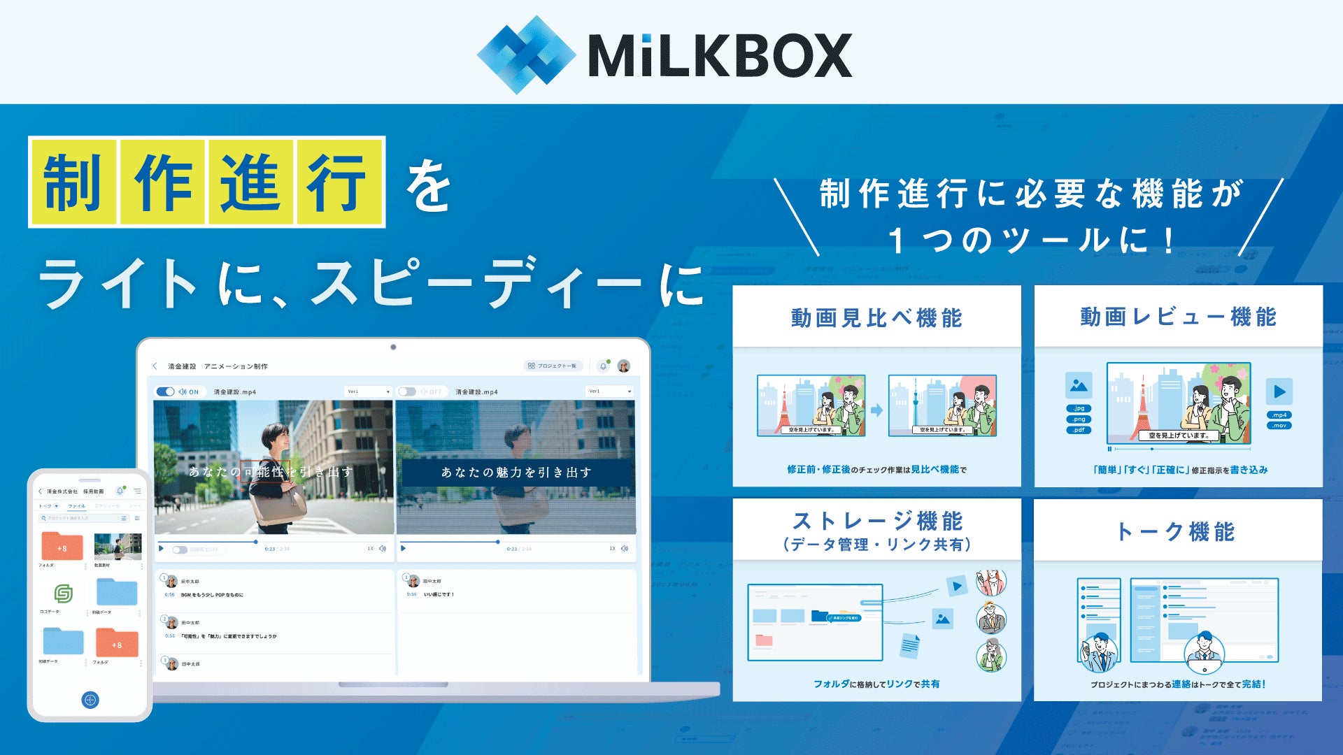 このような背景を踏まえて「MiLKBOX(https://milkbox-video.com)」は、『制作進⾏をライトに、スピーディに』をコンセプトに、制作にまつわるプロジェクト進⾏の⼼⾝への負担をライトにする為のワークフローを実現しました。
